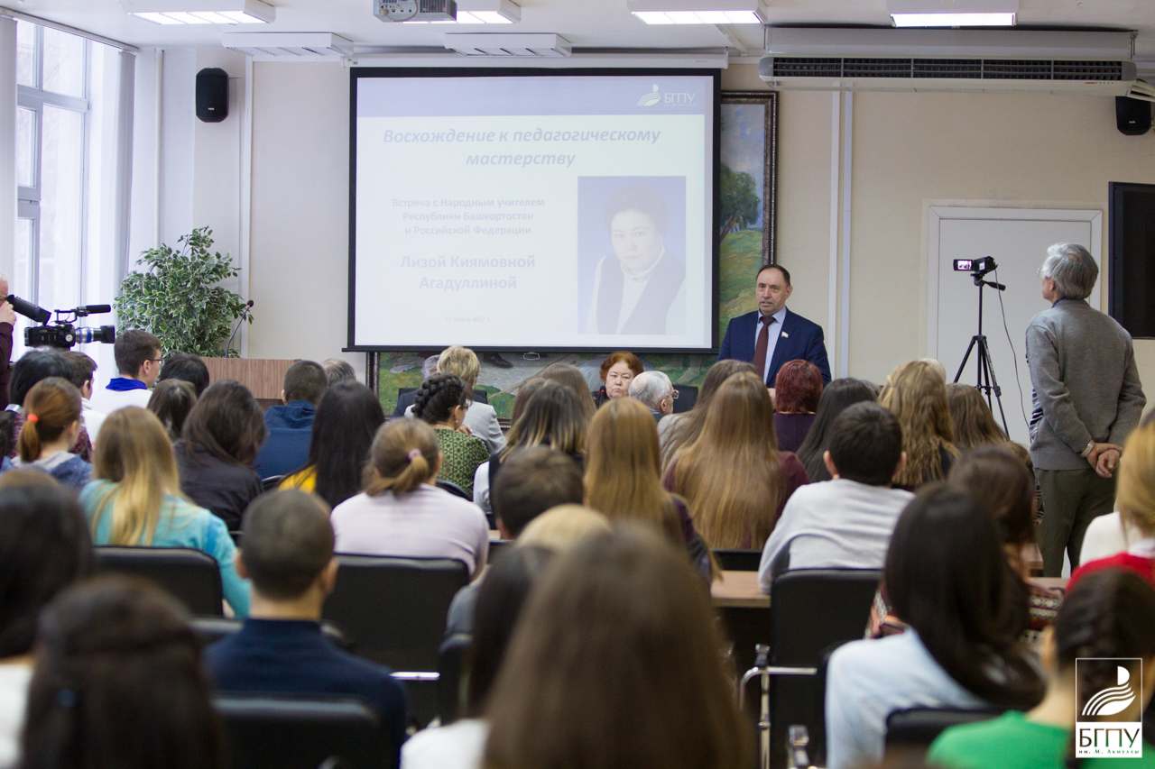 25 марта 2017 года в Центральном читальном зале библиотеки состоялась встреча преподавателей и студентов всех факультетов и институтов БГПУ, а также школьников с Народным учителем РБ и РФ Лизой Киямовной Агадуллиной, первым и единственным педагогом из нашей республики, удостоенным этого высокого почётного звания.