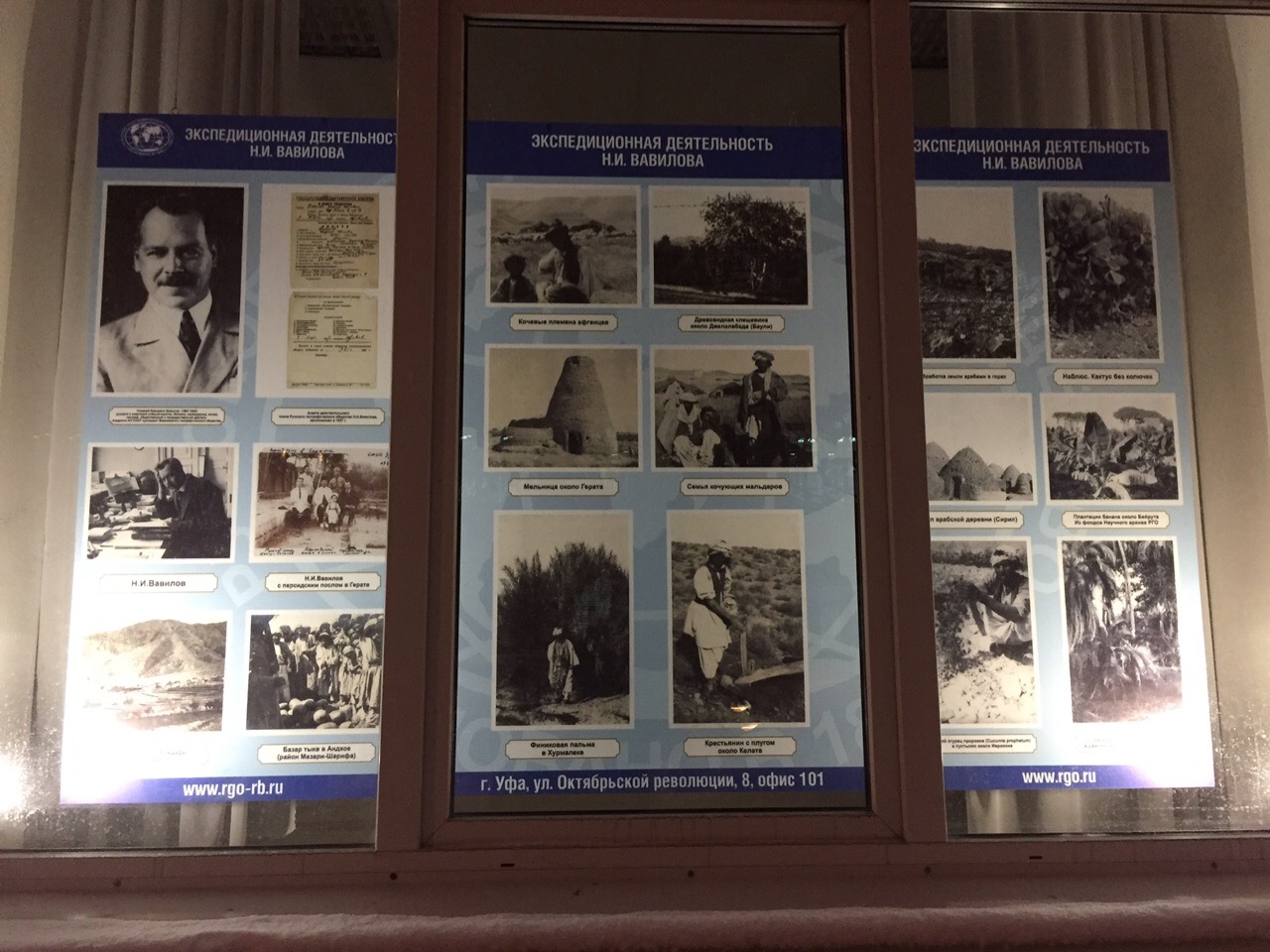 В уфимскую экспозицию вошли копии редких архивных документов, карты, карандашные наброски и фотоснимки, сделанные во время экспедиций выдающихся путешественников и ученых Э.Гофмана и Н.Вавилова, выполненных по заданию Русского географического общества, а также оцифрованные страницы первых русских учебников по географии.