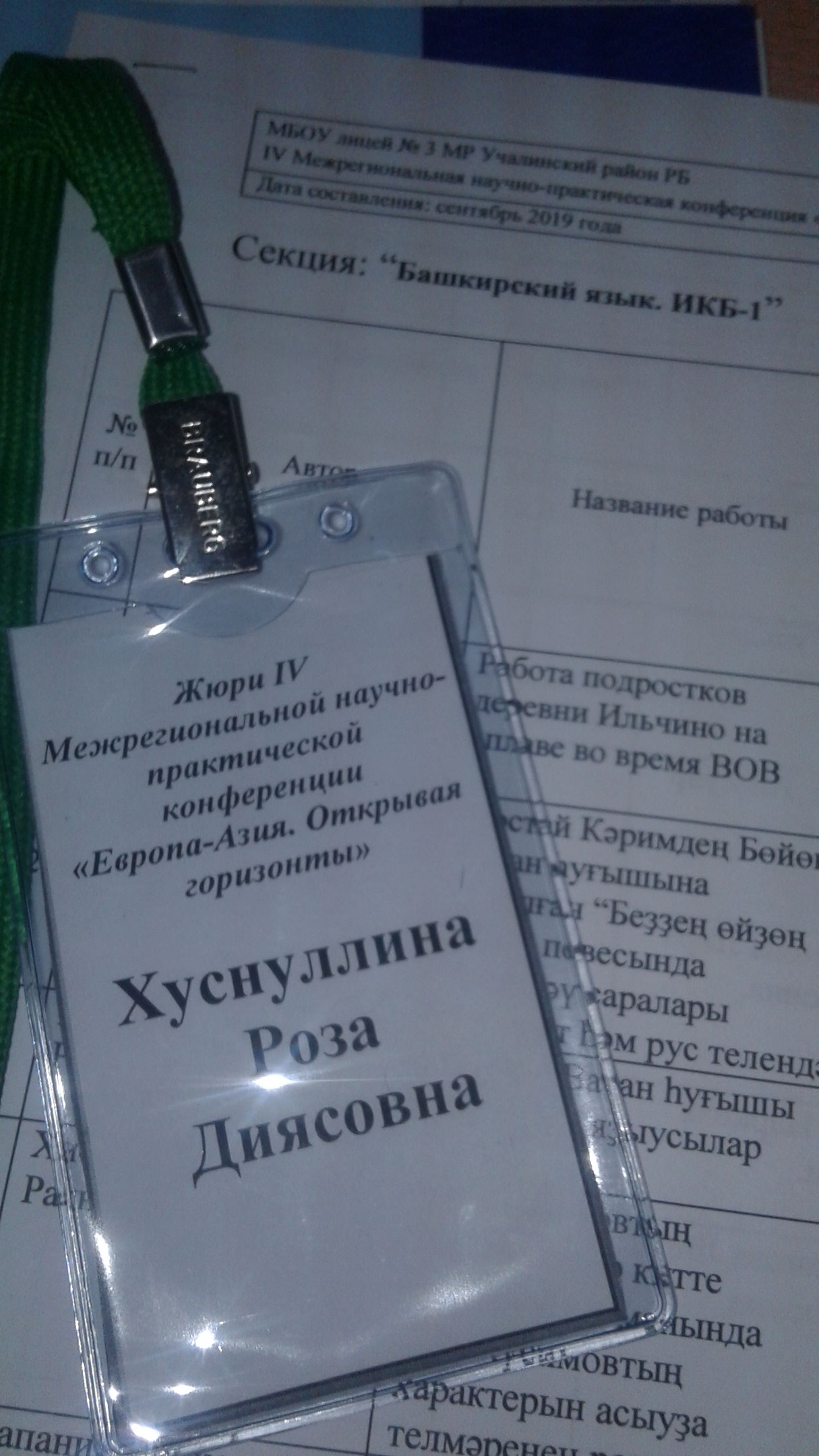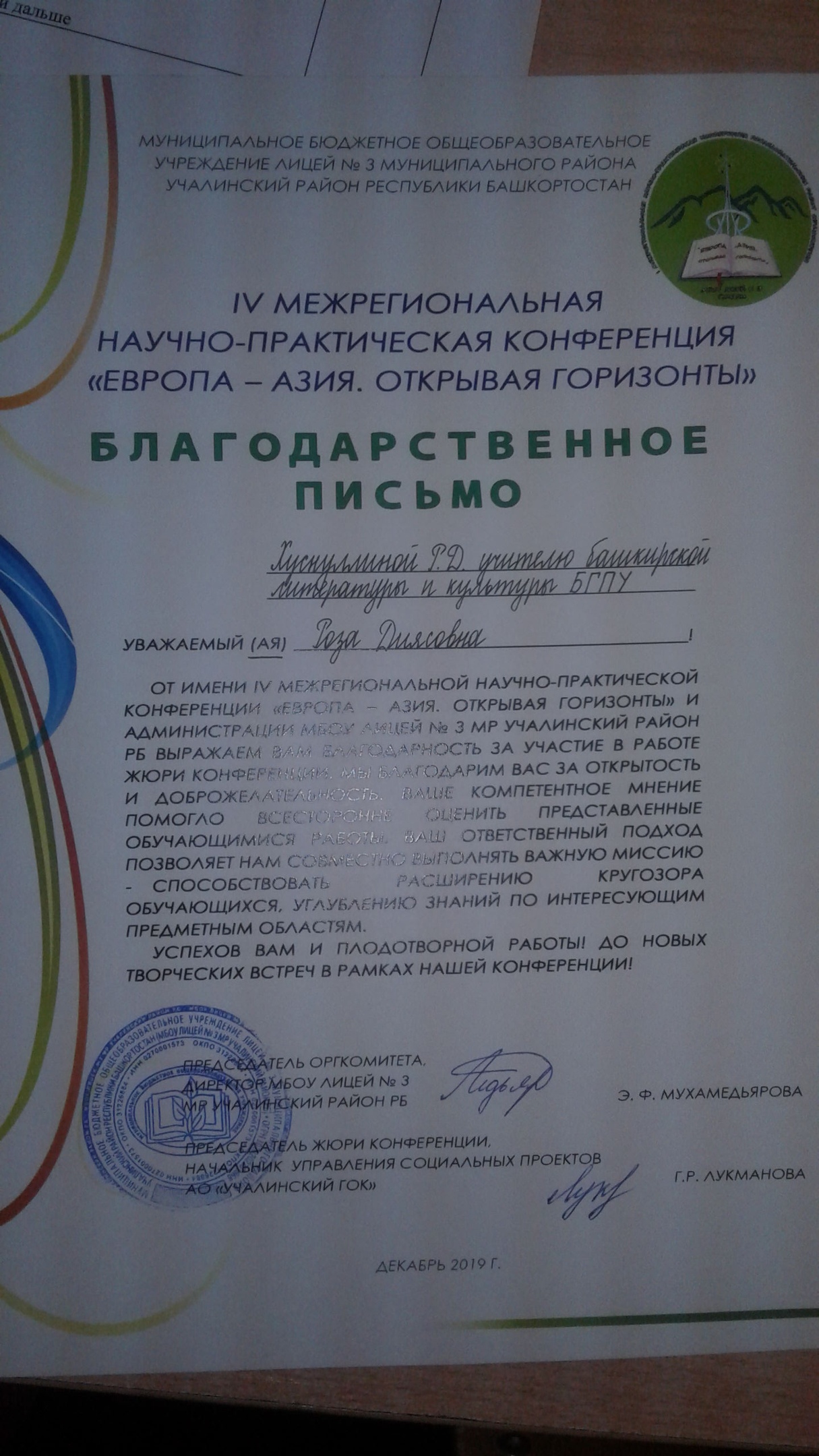 7 декабря 2019 года в г. Учалы состоялась IV Межрегиональная научно-практическая конференция «Европа – Азия. Открывая горизонты», которая проходила в МБОУ Лицей № 3. Организаторы пригласили для работы в качестве экспертной комиссии компетентное жюри из разных образовательных организаций, в том числе, доцента кафедры башкирской литературы и культуры БГПУ им. М. Акмуллы Розу Диясовну Хуснуллину.