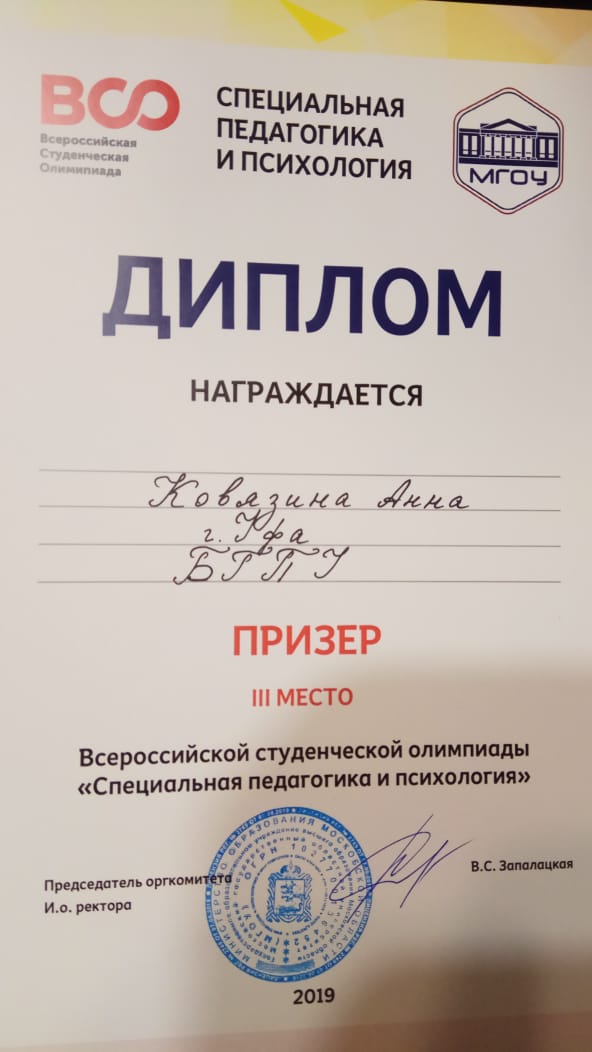 Студентка ИП Анна Ковязина - призер Всероссийской студенческой олимпиады "Специальная педагогика и психология"