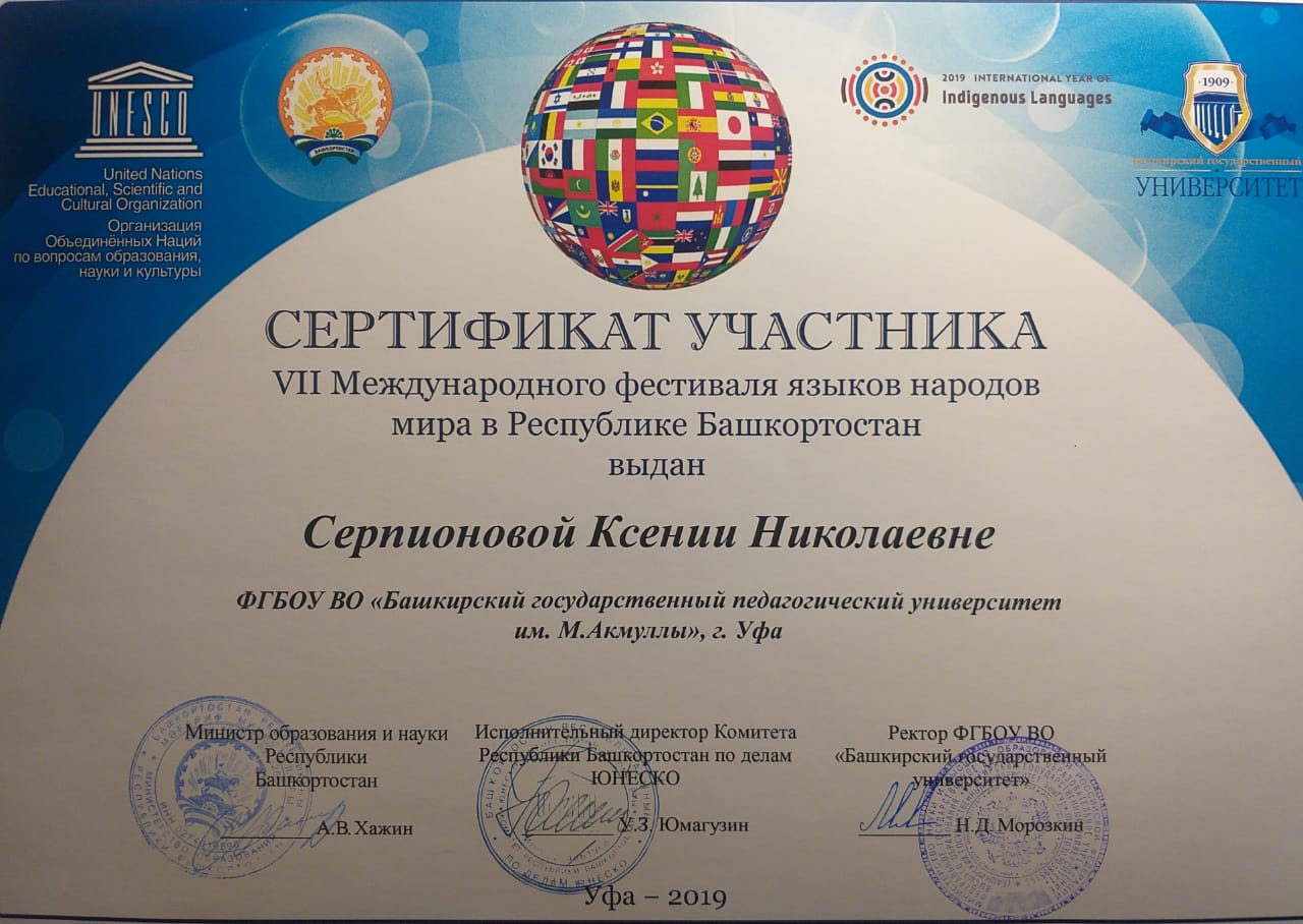17 декабря 2019 г. студенты немецкого отделения ИФОМК приняли участие в VII Международном фестивале языков народов мира в Республике Башкортостан. Фестиваль собрал около 500 участников из разных уголков Башкортостана и мира. Были представлены доклады как о родных языках жителей нашей Республики, так и о языках Европы, Азии и Африки.