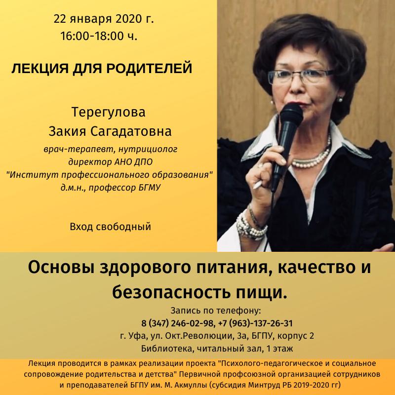 22 января в читальном зале библиотеки 2 корпуса состоится лекция "Основы здорового питания, качество и безопасность пищи". Перед слушателями выступит З.С. Терегулова, врач-терапевт, нутрициолог, директор АНО ДПО "Институт профессионального образования", д.м.н., профессор БГМУ.
