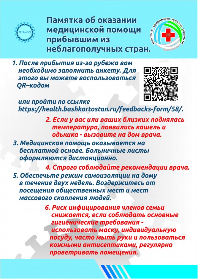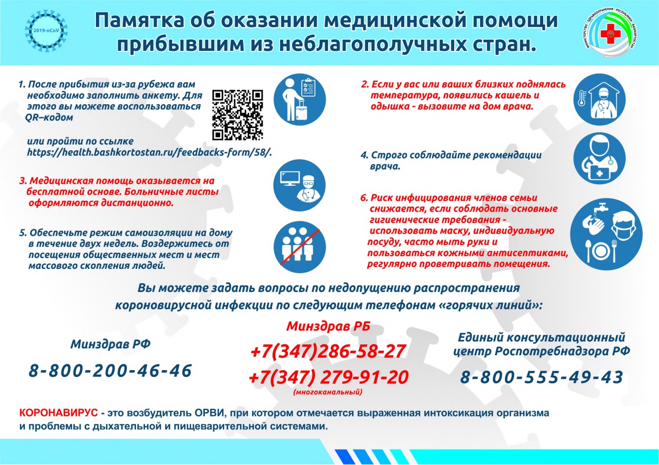 В целях недопущения распространения новой коронавирусной инфекции на территории Республики Башкортостан, рекомендуем ознакомиться с памяткой об оказании медицинской помощи прибывшим из неблагополучных стран.