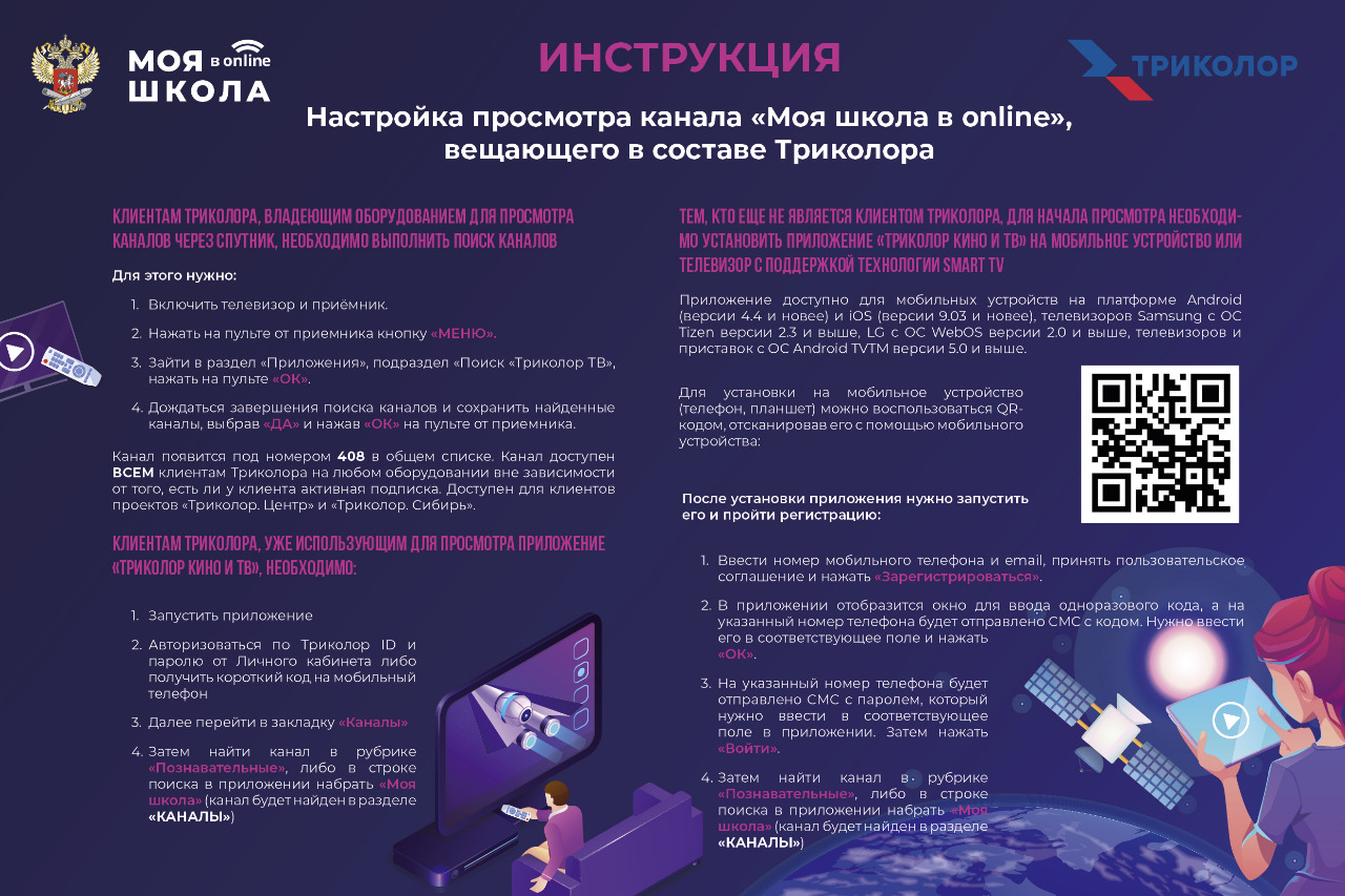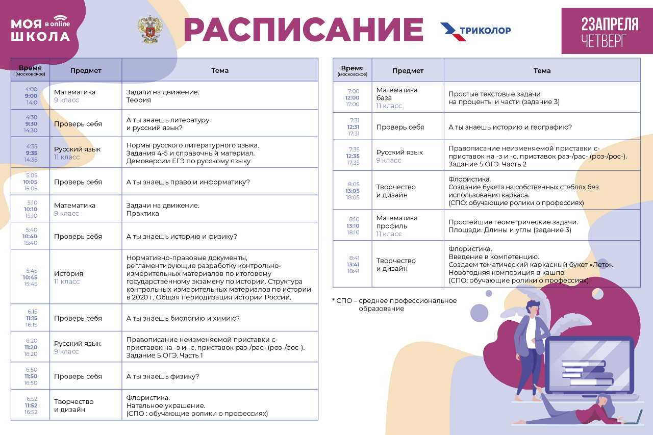 Расписание трансляций будет публиковаться в специальном разделе на сайте Министерства просвещения, в социальных сетях и на портале «Российская электронная школа». Вещание образовательного телеканала «МОЯ ШКОЛА в online» мультиплатформенного оператора цифровой среды «Триколор» продлится до конца учебного года.