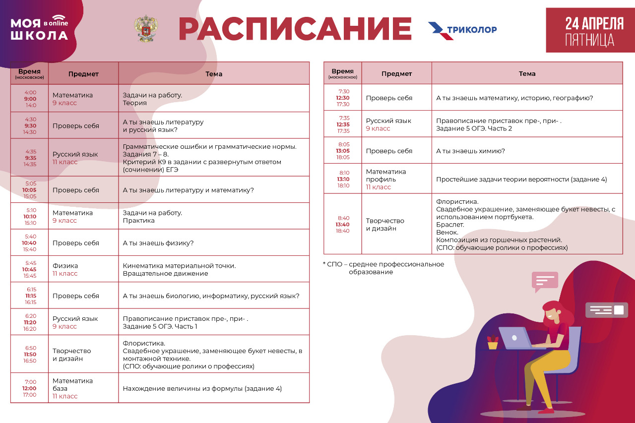 22 апреля Министерство просвещения в партнёрстве с мультиплатформенным оператором цифровой среды «Триколор» на телеканале «МОЯ ШКОЛА в online» запускает образовательное вещание в рамках телепроекта «МОЯ ШКОЛА в online», которое поможет старшеклассникам быстро и качественно подготовиться к экзаменам этого года.