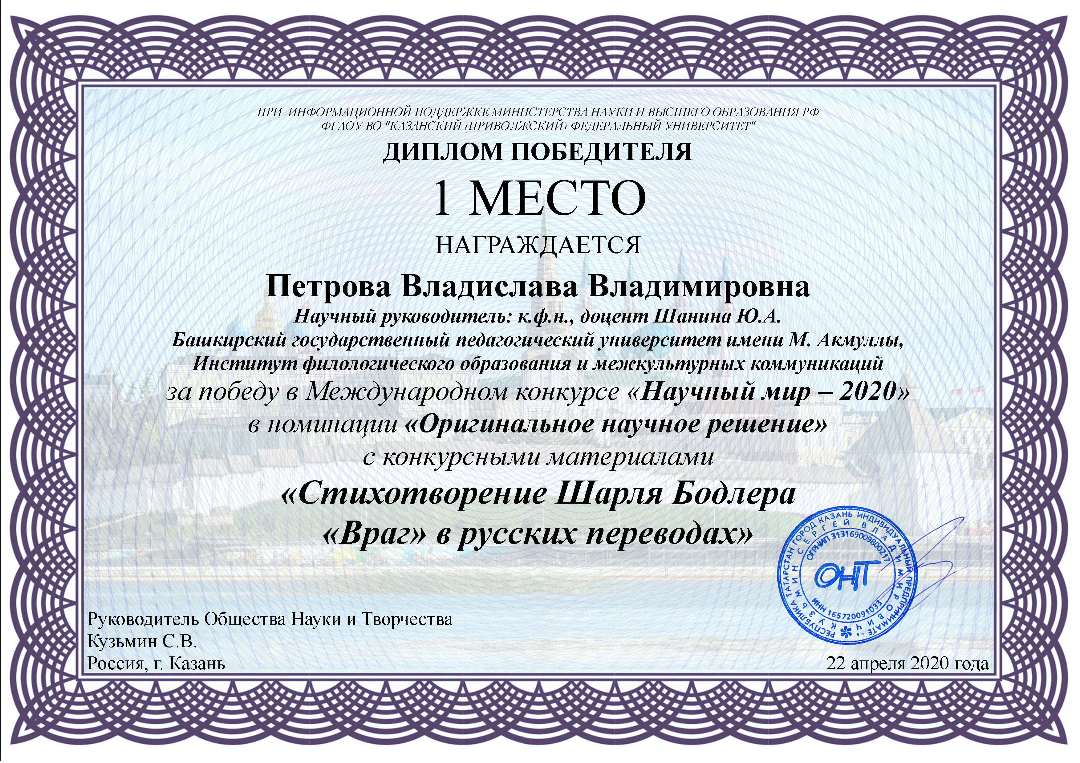 22 апреля 2020 года состоялся Международный конкурс презентаций «Научный мир – 2020», организованный «Обществом науки и творчества» при информационной поддержке Министерства науки и высшего образования РФ, ФГАОУ ВО «Казанский федеральный университет».