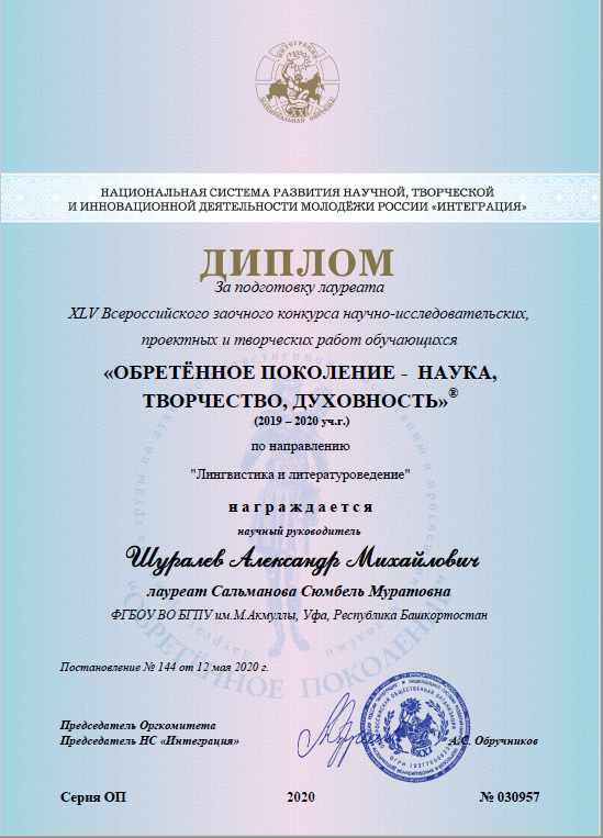 Магистрант 2 курса ИФОМК Сальманова Сюмбель Муратовна под научным руководством профессора кафедры русской литературы А.М.Шуралёва стала лауреатом XLV Всероссийского заочного конкурса научно-исследовательских, проектных и творческих работ обучающихся «Обретённое поколение – наука, творчество, духовность» по направлению «Лингвистика и литературоведение».