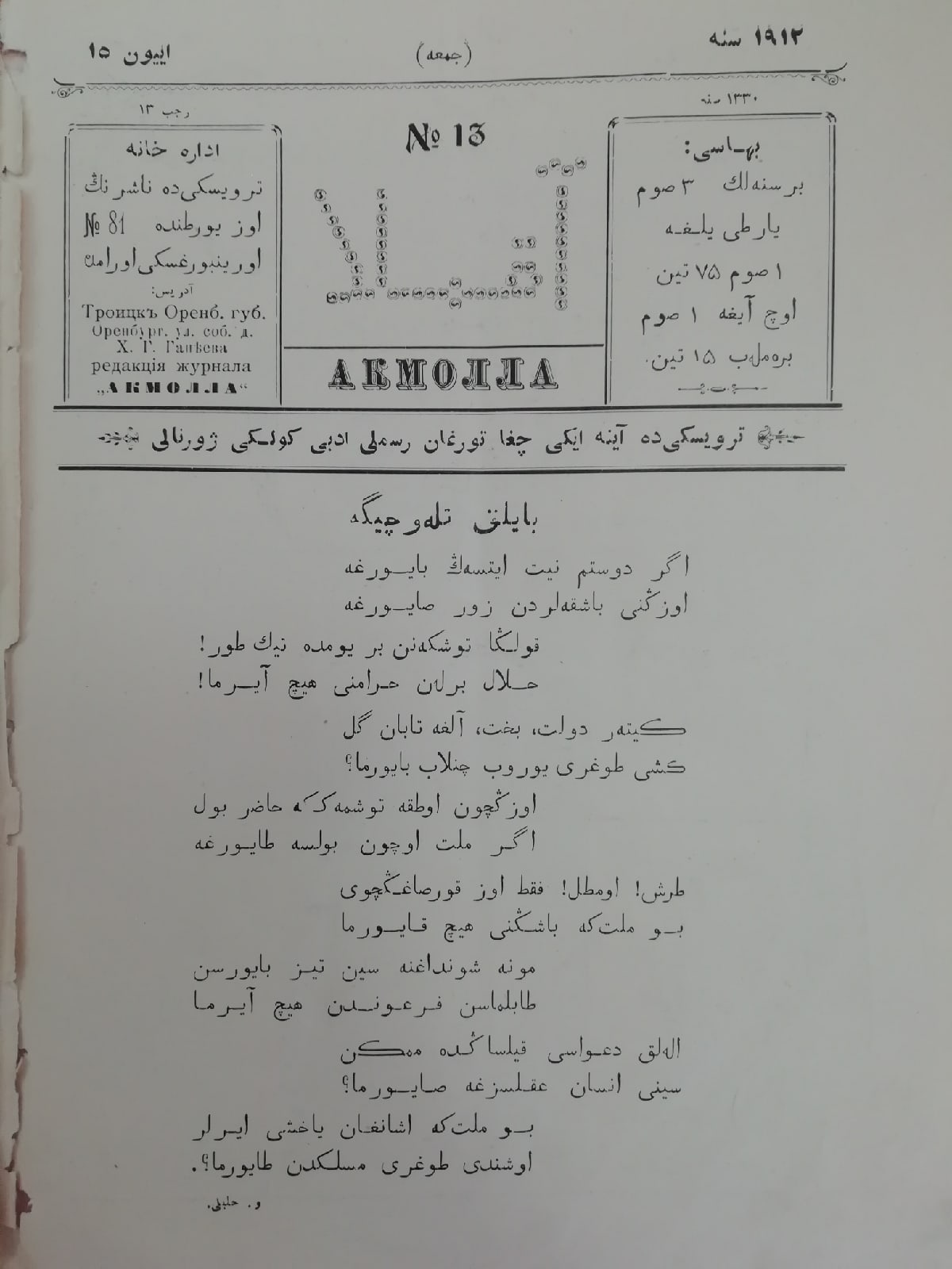 Этот журнал выходил два раза в месяц с июля 1911 г. по январь 1916 г. в городе Троицк на старотюркском языке. Журнал назван в честь Мифтахетдина Акмуллы, башкирского поэта-просветителя, чье имя гордо носит наш университет. В журнале публиковались сатирические и юмористические произведения башкирских, татарских и казахских авторов, в том числе стихи известного башкирского поэта Ш. Бабича. Язык журнала отличается от современного башкирского языка тем, что он на арабской графике, содержит большое количество арабизмов и старотюркских слов.
