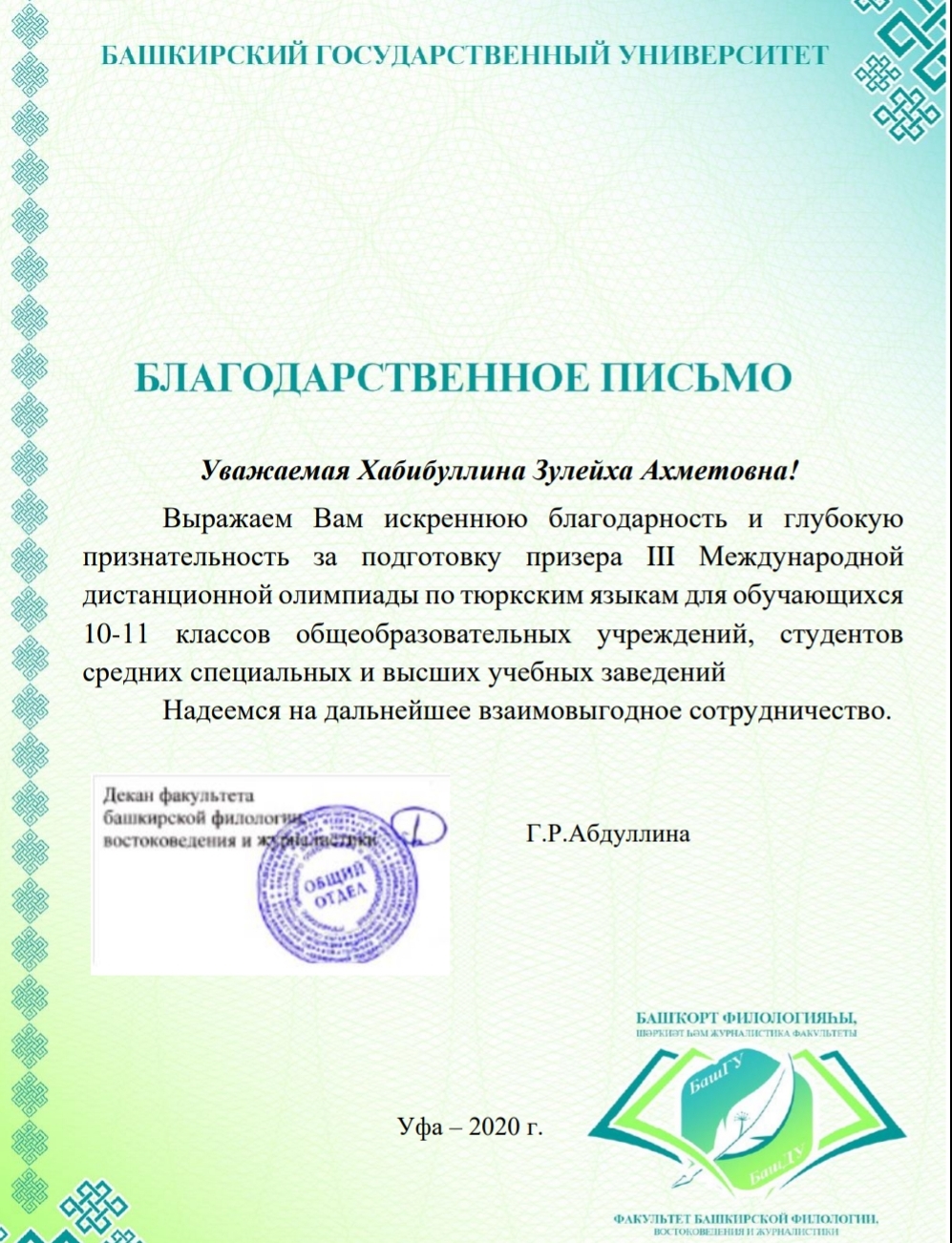 2 апреля 2020 года в БашГУ прошла III Международная дистанционная олимпиада по тюркским языкам для обучающихся 10-11 классов общеобразовательных учреждений, студентов средних специальных и высших учебных заведений. Стали известны результаты данной олимпиады. Студентка факультета башкирской филологии Назгуль Хабибуллина стала призёром и награждена Дипломом III степени. Сертификатами участника награждены Тангатарова Лейсан, Шагивалиева Диана, Булякбаева Загира, Хазиева Гульдар и Шарафутдинова Миляуша.