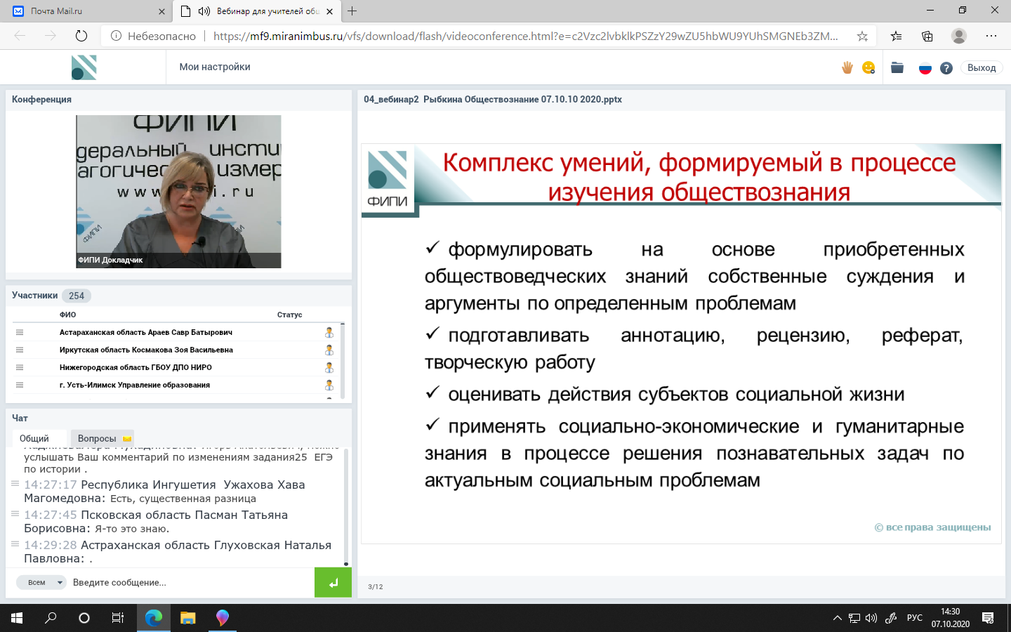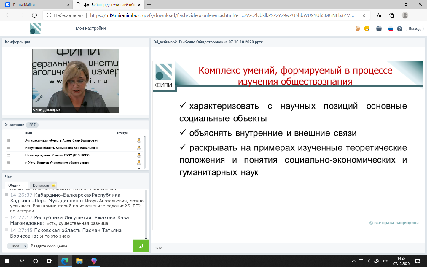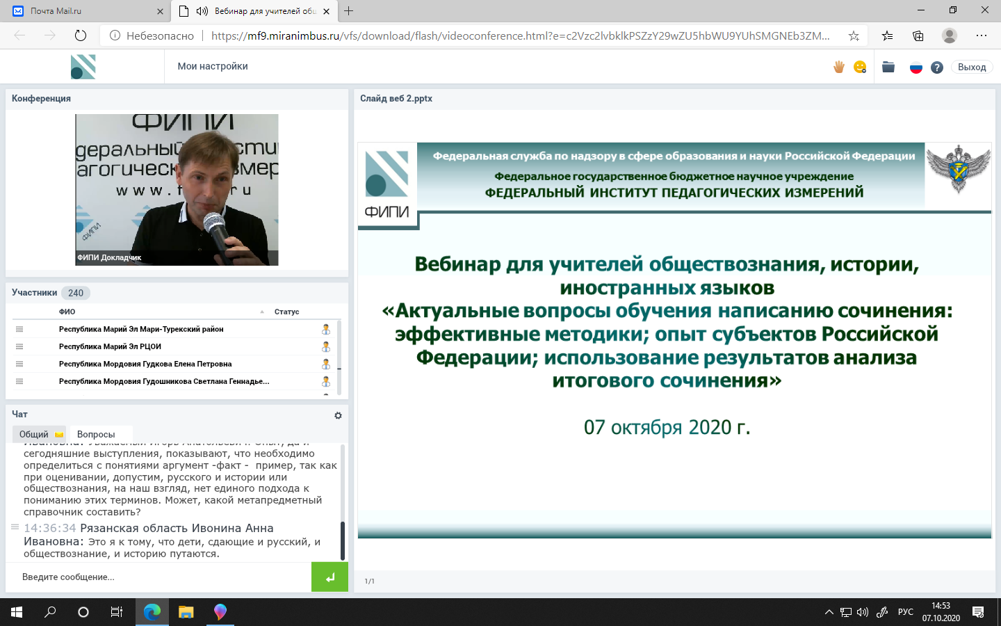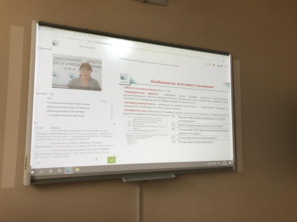 07 октября 2020 года на базе ФГБНУ «Федеральный институт педагогических измерений» состоялся вебинар для учителей обществознания, истории, иностранных языков на тему «Актуальные вопросы обучения написанию сочинения: эффективные методики; опыт субъектов Российской Федерации; использование результатов анализа итогового сочинения».