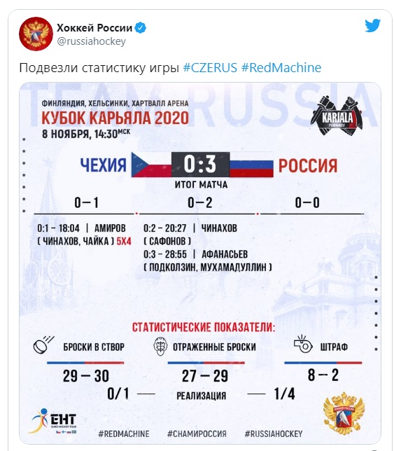 Сборная России по хоккею нанесла поражение команде Чехии и стала победителем финского этапа Евротура - Кубка Карьяла.