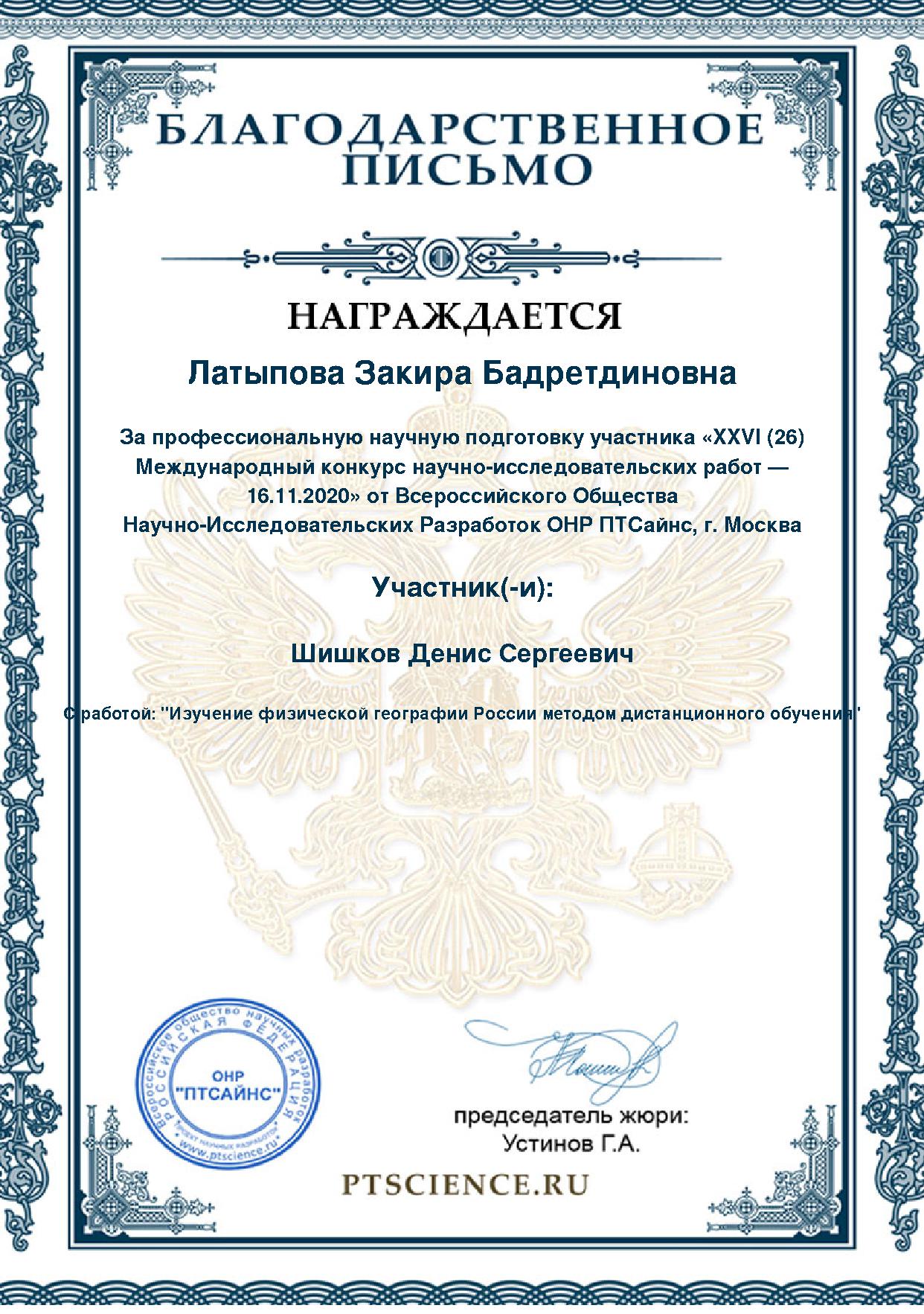 Поздравляем магистра 1 курса профиля «Географическое образование» Шишкова Дениса и его руководителя доц. Латыпову З.Б. с получением Диплома 1 степени в Международном конкурсе научно-исследовательских работ в номинации «Дипломные работы по педагогическим наукам».
