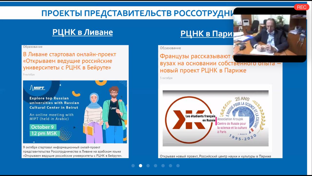 В рамках проблемно-целевого вебинара были подведены  итоги  года и  определение  перспективных  направлений реализации проекта в 2021 году. Так же участники вебинара обсудили наиболее проблемные вопросы, выявленным в ходе работы в 2020 году. Присутствующий на вебинаре начальник отдела сотрудничества в сфере высшего и  образования и науки Россотрудничества Игорь Анатольевич Поляченко подвел итоги приема иностранных студентов по квоте, а так же рассказал о дополнительных возможностях участия абитуриентов в отборе на получение квоты для обучения в российских вузах по программам аспирантуры.