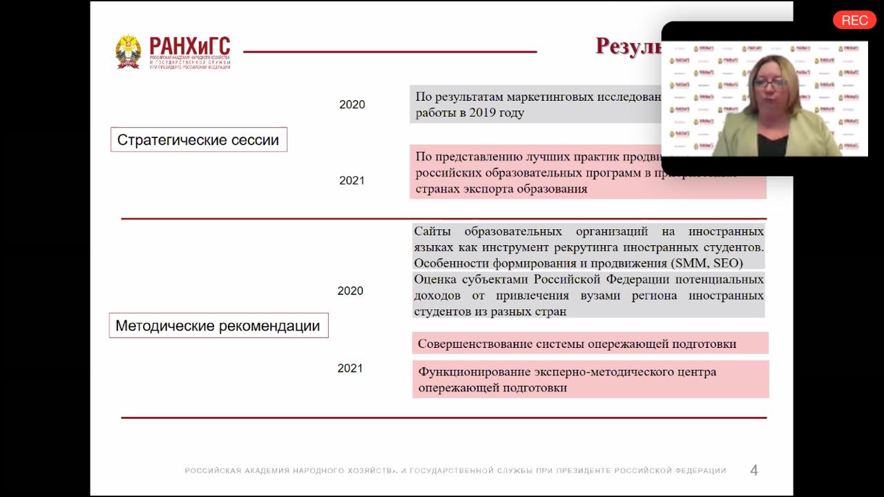 4 декабря 2020 года состоялся проблемно-целевой вебинар для  руководителей  и сотрудников  международных  служб  по  организации  работы  по  реализации мероприятий  федерального  проекта  (достижении  целевого  показателя удвоения численности иностранных студентов в российских вузах)   на тему: «Экспорт образования: результаты и перспективы». Организаторами вебинара выступили  РАНХиГС и РУДН.