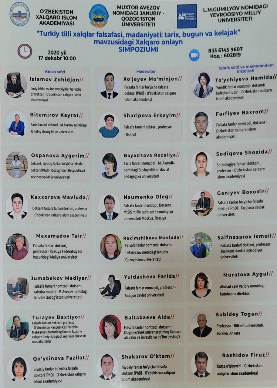 17 декабря 2020 г. к.и.н., старший научный сотрудник НИЦ духовного развития Баязитова Р.Р. принимала участие в работе Международного онлайн-симпозиума «Философия, культура тюркоязычных народов: история, настоящее и будущее», организованного Международной исламской академией Узбекистана.