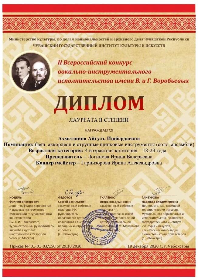 Студентка кафедры МХО Ахметшина Айгуль - лауреат II степени II Всероссийского конкурса вокально-инструментального исполнительства им. В. и Г. Воробьевых