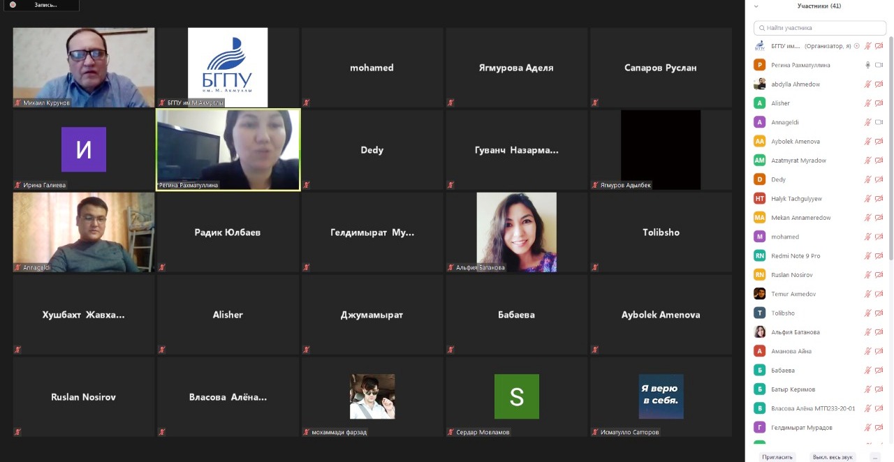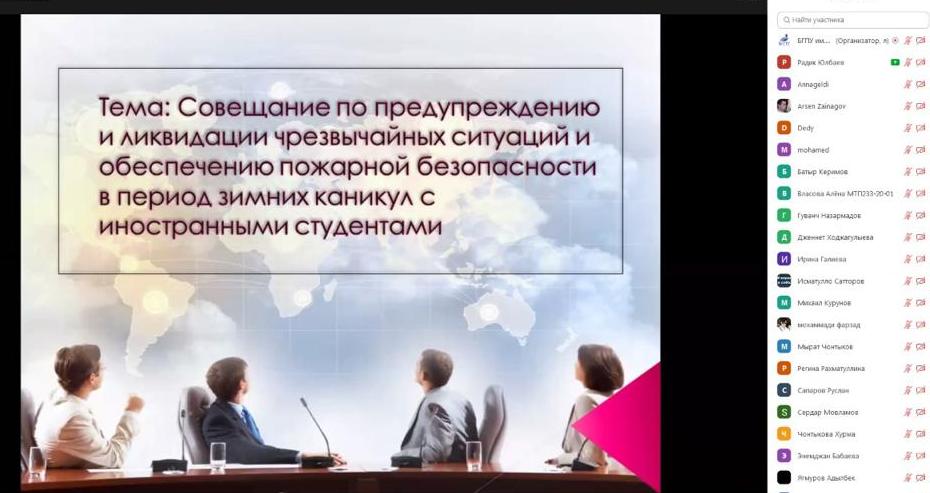 25 декабря 2020 г. состоялось совещание в дистанционном формате на платформе Zoom для иностранных обучающихся БГПУ им.М. Акмуллы, посвящённое вопросам организации отдыха студентов в период зимних каникул, предупреждения и ликвидации чрезвычайных ситуаций и обеспечения пожарной безопасности в зимний период.