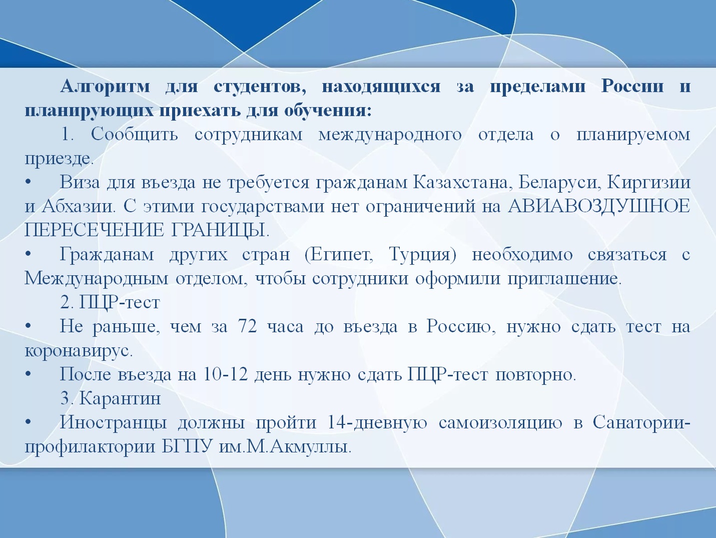 1. иностранным студентам обращаться в деканаты для устранения академических задолженностей;