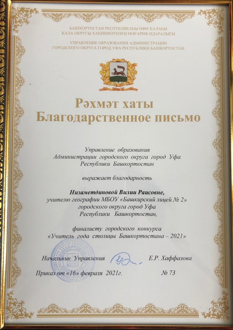 Магистрант 1 курса естественно-географического факультета Вилия Низаметдинова стала финалистом городского конкурса «Учитель года столицы Башкортостана-2021».