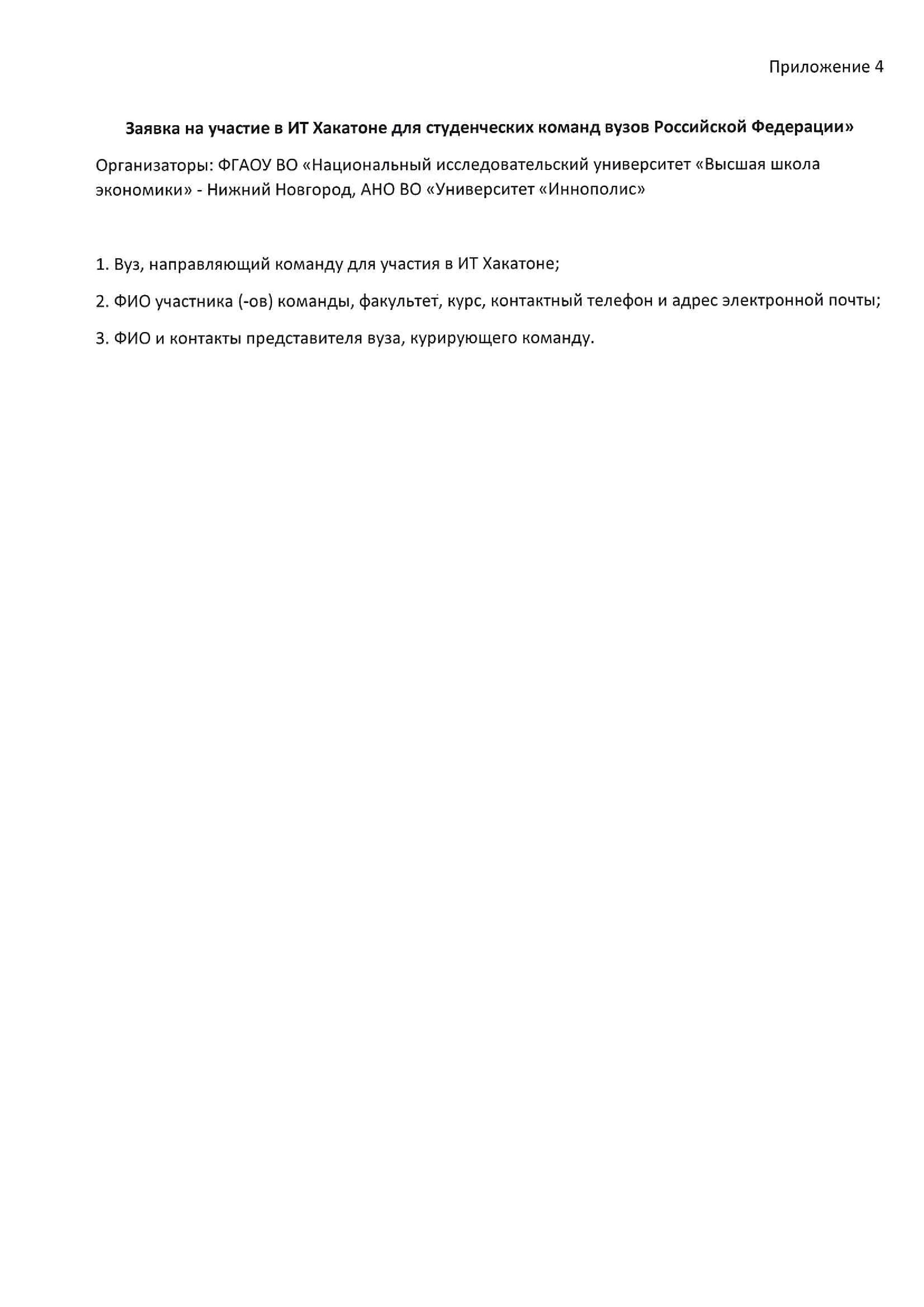 Для участие в Хакатоне необходимо отправить заявку, заполненную по приложенной форме, модератору от НИУ ВЭШ – Нижний Новгород Изабэле Юдимовне Порус (prof-up@yandex.ru, тел. +7 (902) 309 71 29). Контактное лицо от Университета Иннополис – Андрейс Блакуновс (a.blakunovs@innopolis.ru, тел. +7 (937) 622 07 63).
