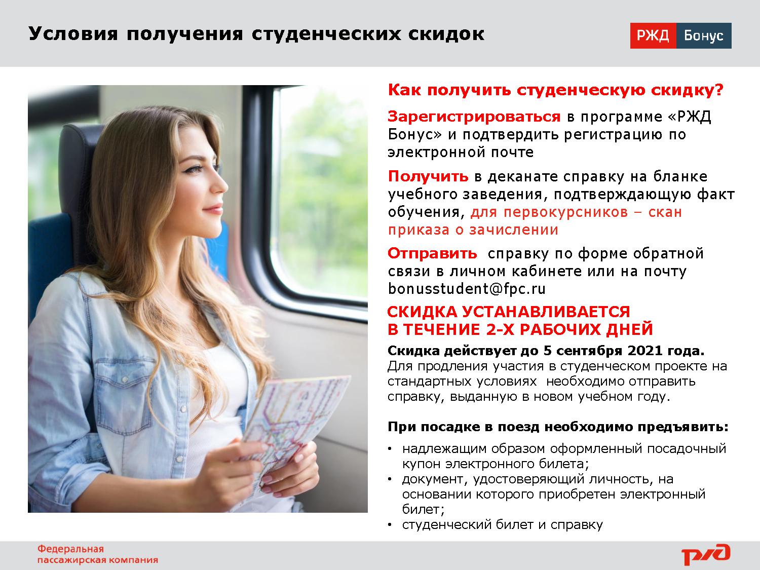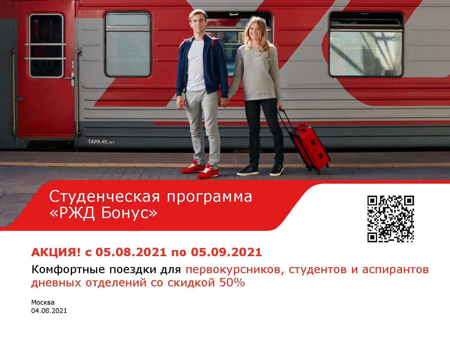 «РЖД Бонус» дарит повышенную скидку 50% студентам и первокурсникам 2021 года до конца лета. Акция проводится в период с 05.08.2021 г. по 05.09.2021 г. Скидку могут получить студенты и аспиранты очных отделений учебных учреждений высшего и среднего профессионального образования Российской Федерации, в том числе студенты-первокурсники 2021 года поступления. Скидка действует в вагонах купе поездов дальнего следования и вагонах с местами для сидения скоростных поездов АО «ФПК», курсирующих во внутригосударственном сообщении. Скидка в размере 50% от применяемого тарифа на проезд.