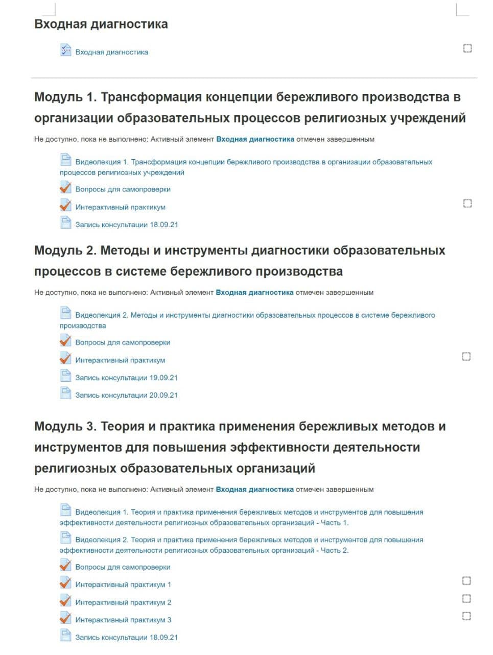 Итоги реализации программы свидетельствуют о значительном внимании образовательного сообщества к освоению и внедрению бережливых процессов в деятельность религиозных образовательных организаций и необходимостью профессиональной подготовки представителей религиозных образовательных организаций, обладающих не только теоретико-методологической базой в области теологии и религиоведения, но и владеющих знаниями, умениями и навыками в области организации бережливых процессов и применения бережливых методов и инструментов в своей деятельности.