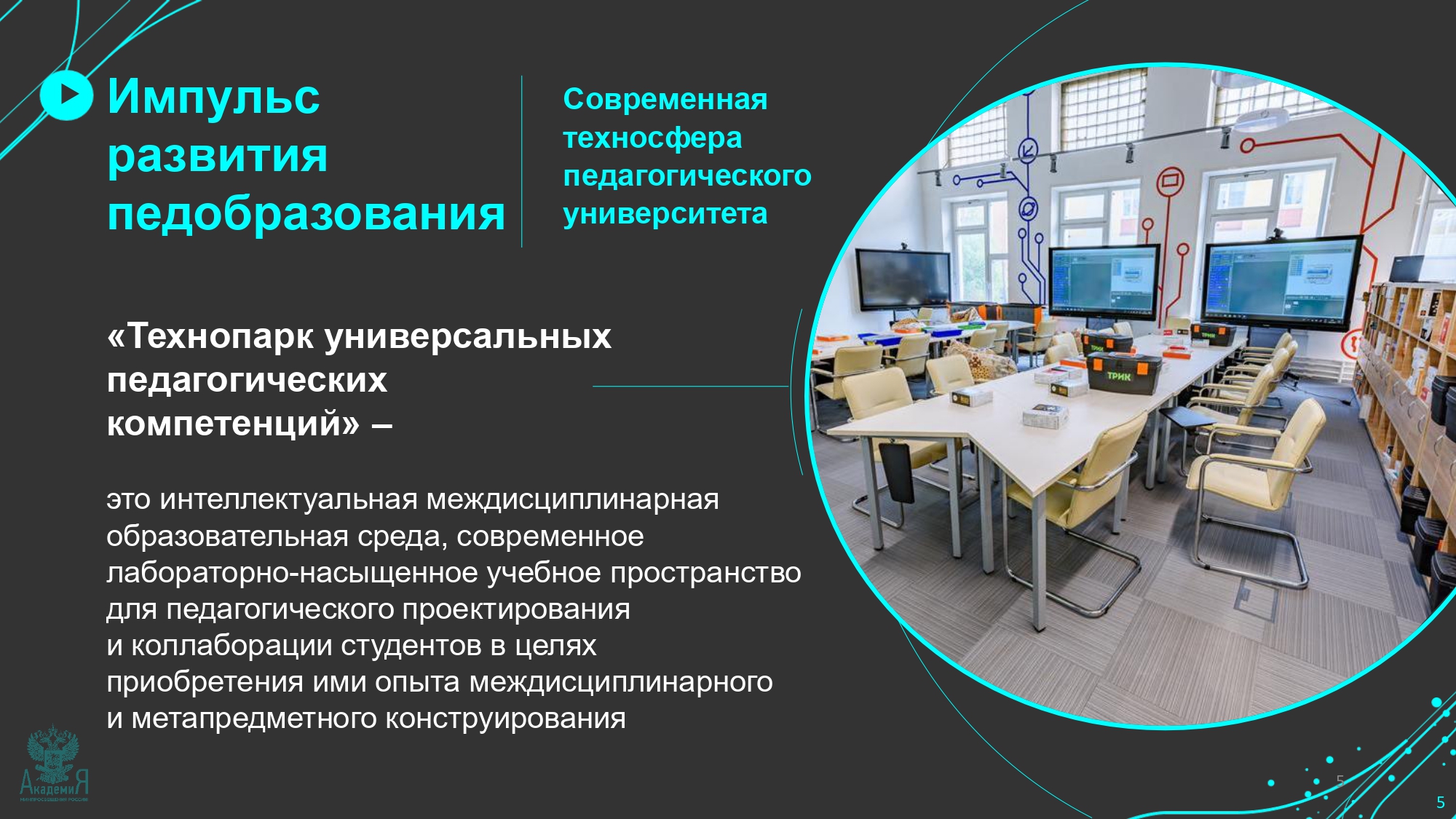 Технопарки универсальных педагогических компетенций в педагогических университетах – это высокий стандарт образовательных аудиторий и лабораторий, не только оснащенных высокотехнологичным оборудованием, но и оформленных в современных тенденциях дизайна.