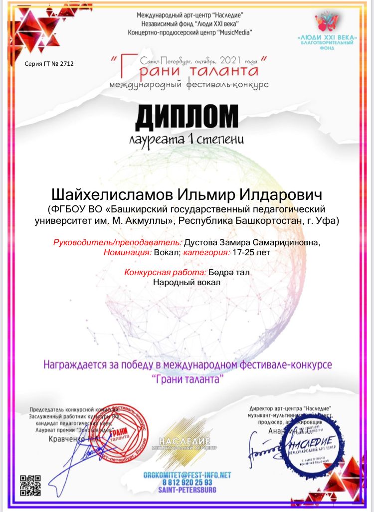 Шайхелисламов Ильмир - Лауреат I степени в номинации "Народный вокал (соло)", категория: 17-25 лет.