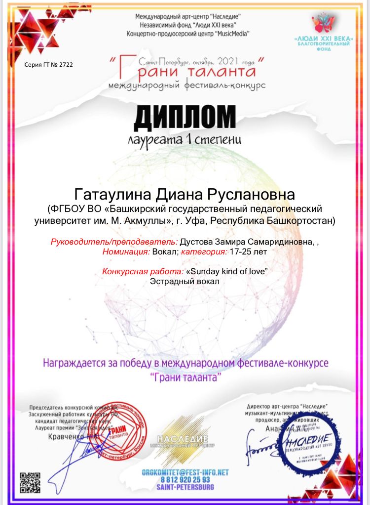Гатаулина Диана - Лауреат I степени в номинации "Эстрадный вокал (соло)", категория: 17-25 лет;