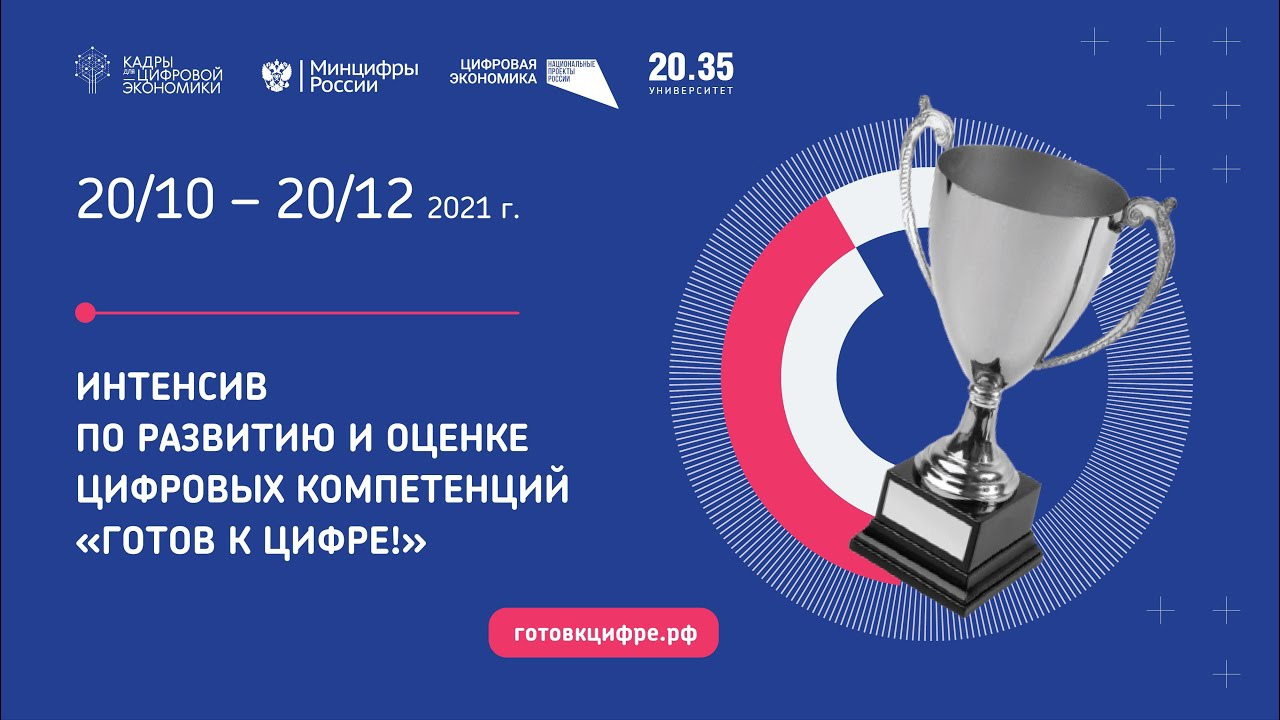 Центр компетенций по кадрам для цифровой экономики Университета 2035 в партнёрстве с Консорциумом по развитию цифровой грамотности и компетенций цифровой экономики и при поддержке Минцифры России проводит масштабное мероприятие — Интенсив «Готов к цифре!». К участию в Интенсиве приглашается широкий круг лиц: школьники, студенты, учителя и преподаватели, граждане трудоспособного и старшего возраста. Мероприятие пройдет в рамках федерального проекта «Кадры для цифровой экономики» национальной программы «Цифровая экономика РФ».