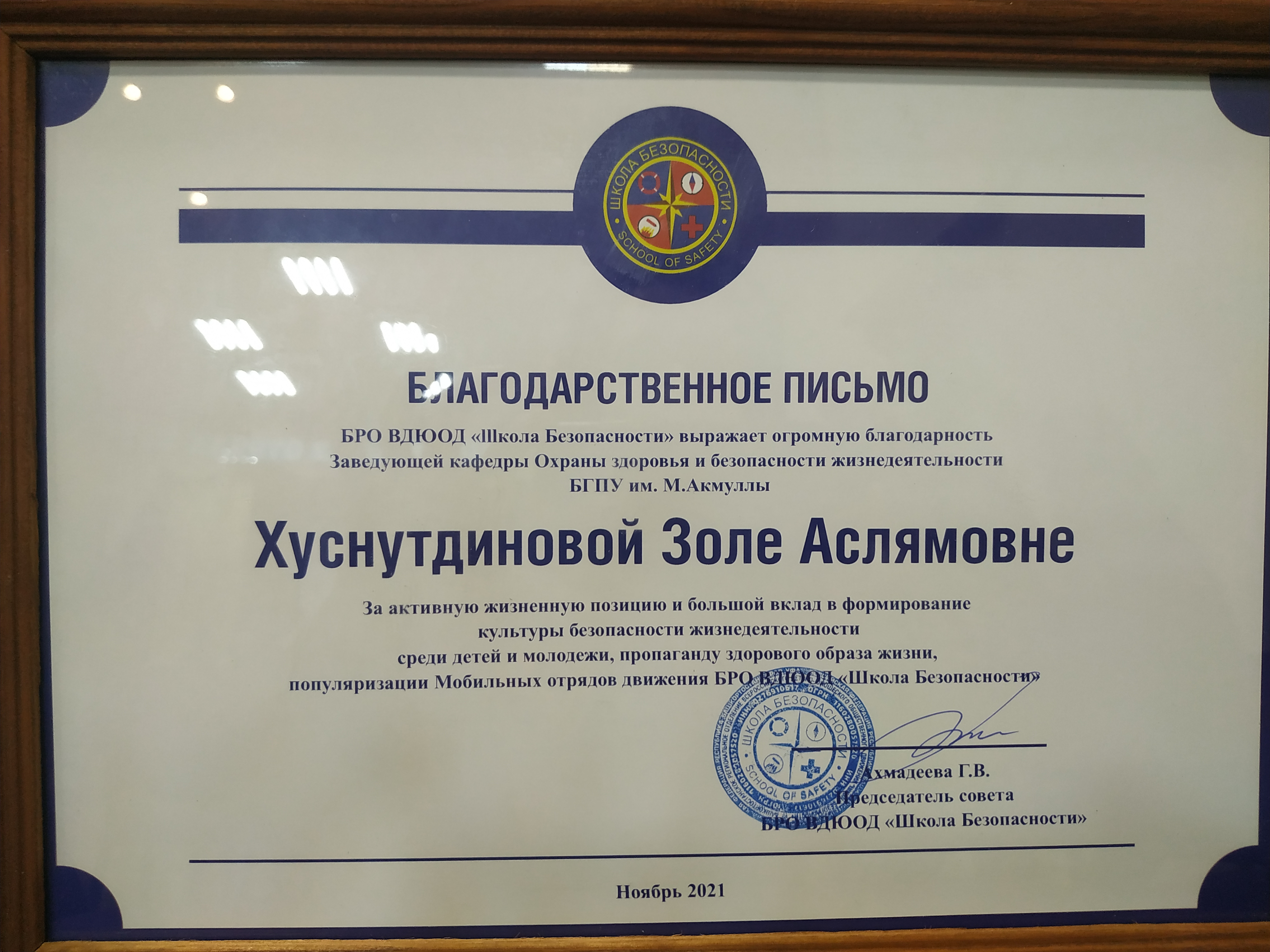 За содействие в развитии и популяризацию деятельности ВДЮОД «Школа безопасности» в Республике Башкортостан, воспитание культуры безопасности и пропаганду здорового образа жизни, заведующему кафедрой ОЗ и БЖ, профессору  Хуснутдиновой З.А. вручено Благодарственное письмо, а старший преподаватель кафедры физического воспитания и спортивной борьбы Лихачева Г.Т. отмечена Благодарностью Центрального Совета ВДЮОД «Школа безопасности».