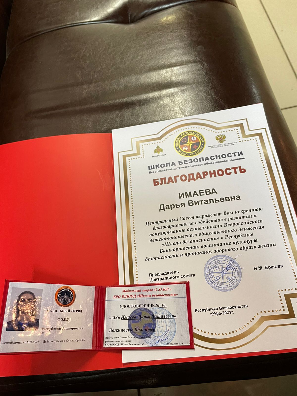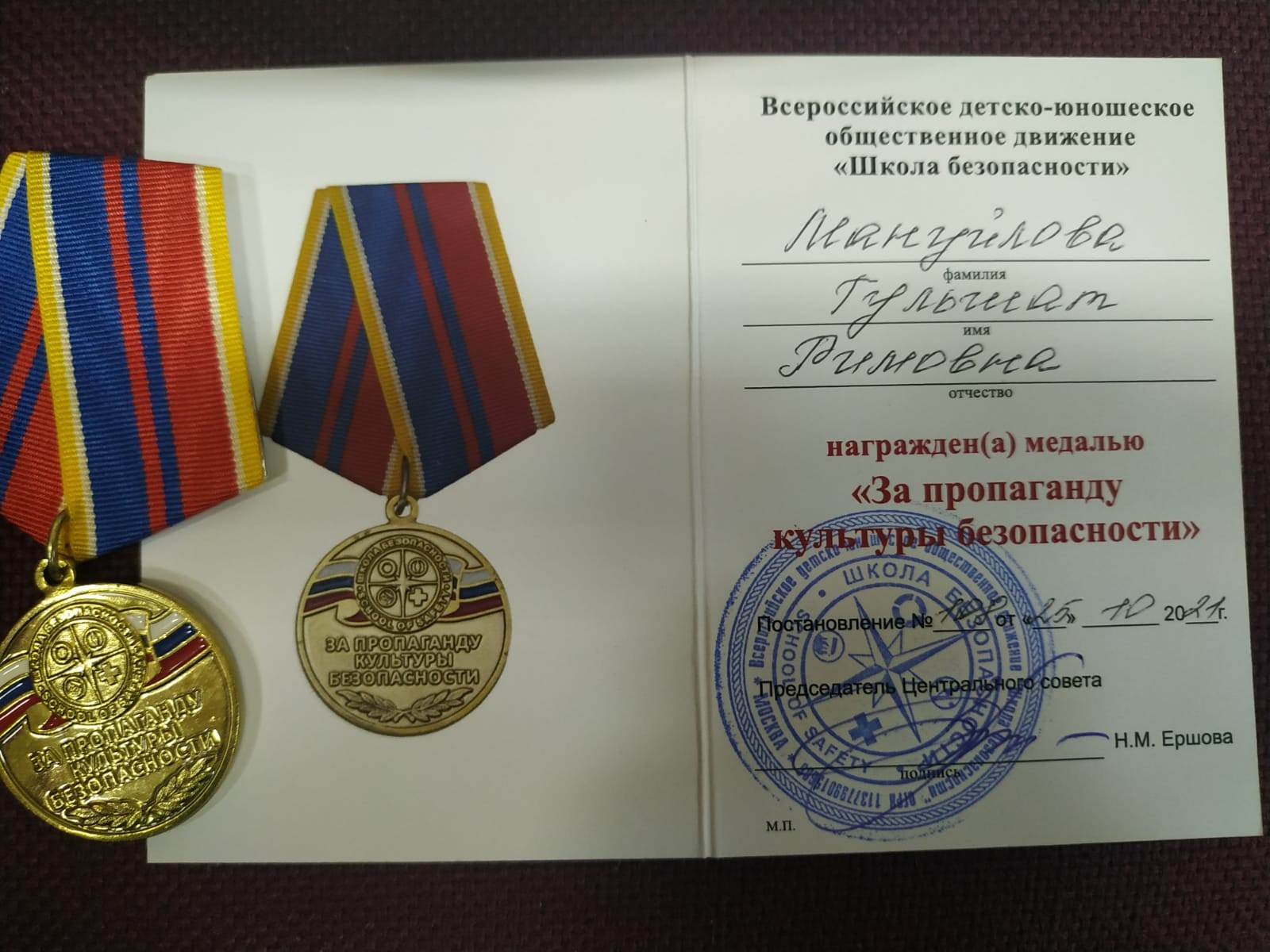 Деятельность в составе Мобильного отряда студентов – волонтеров 5 курса БГПУ им. М.Акмуллы Альбины Галимьяновой и Дарьи Имаевой  была отмечена Благодарностями Центрального Совета Всероссийского детско-юношеского общественного движения «Школа безопасности», которые вручила  Ершова Н.М., Председатель Центрального Совета. Она же вручила доценту кафедры ОЗиБЖ Мануйловой Г.Р.  высокую награду – ведомственную медаль «За пропаганду культуры безопасности» Всероссийского детско-юношеского общественного движения «Школа безопасности».