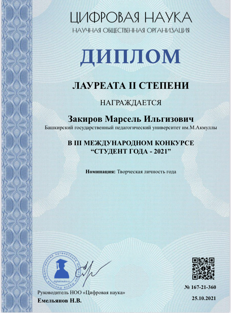 В ноябре 2021 г. на базе научно-образовательной платформы "Цифровая наука" прошел III Международный конкурс "Студент года - 2021".