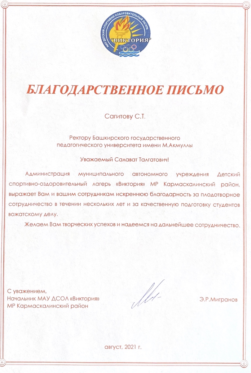 По итогам летней оздоровительной кампании 2021 года в адрес Акмуллинского университета поступают многочисленные благодарные отзывы. Организации отдыха детей и их оздоровления отмечают наличие у наших студентов-вожатых необходимых профессиональных и общекультурных компетенций, творческой инициативы, высокой мотивации к работе с детьми, выражают искреннюю благодарность всему профессорско-преподавательскому составу вуза, заинтересованность в дальнейших партнерских отношениях с целью формирования и развития кадрового потенциала детских здравниц.