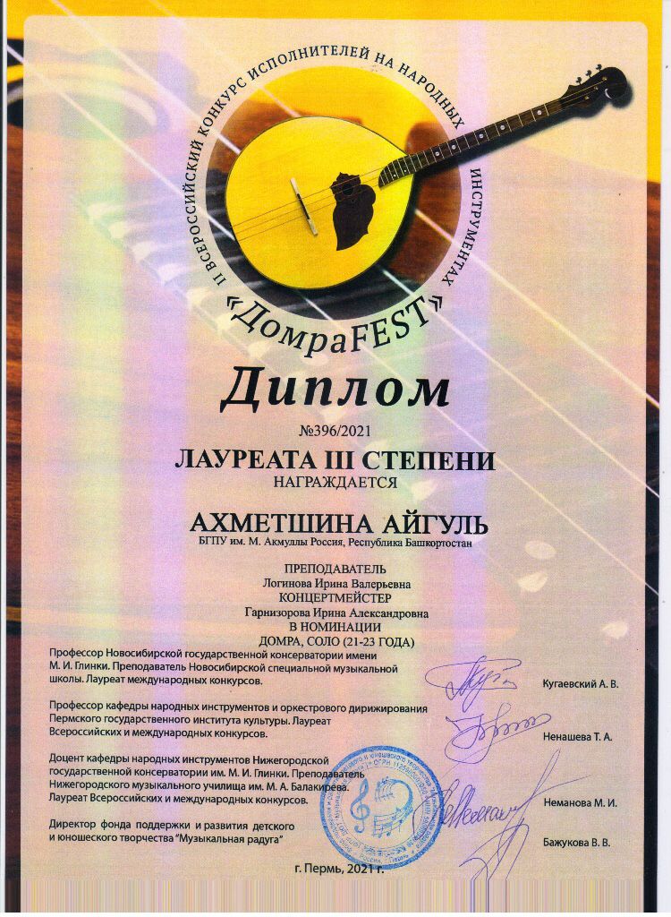 Студентка кафедры музыкального и хореографического образования Айгуль Ахметшина стала лауреатом III степени в номинации "Домбра, соло (21-23 года)" во II Всероссийском конкурсе исполнителей на народных инструментах "ДомбраFEST", который состоялся в г. Пермь. Поздравляем также педагога Логинову Ирину Валерьевну и  концертмейстера Гарнизорову Ирину Александровну.