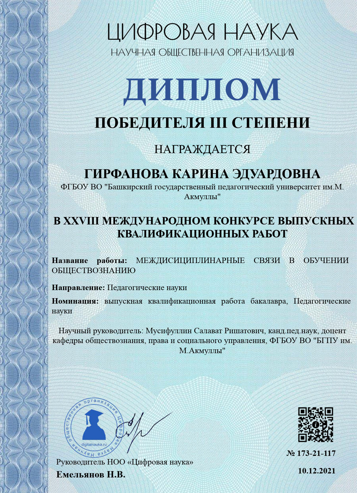 Карина Эдуардовна Гирфанова – диплом III степени в номинации «Педагогические науки» (за работу «МЕЖДИСЦИПЛИНАРНЫЕ СВЯЗИ В ОБУЧЕНИИ ОБЩЕСТВОЗНАНИЮ», научный руководитель – Салават Ришатович Мусифуллин, канд.пед.наук, доцент кафедры обществознания, права и социального управления).