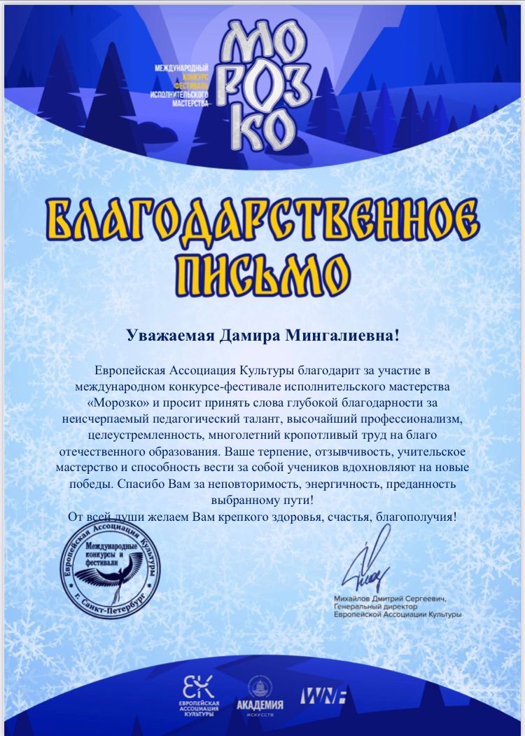 Студент 3 курса кафедры МХО Марсель Закиров стал Лауреатом I степени Международного конкурса-фестиваля исполнительского мастерства "Морозко" в номинации "Вокальное искусство" возрастной категории 17-20 лет. На суд жюри Марсель представил конкурсный номер "Сыновья своей страны". Поздравляем студента и его педагога - Дамиру Мингалиевну Яппарову - с высоким достижением. Желаем новых творческих успехов в наступающем году!
