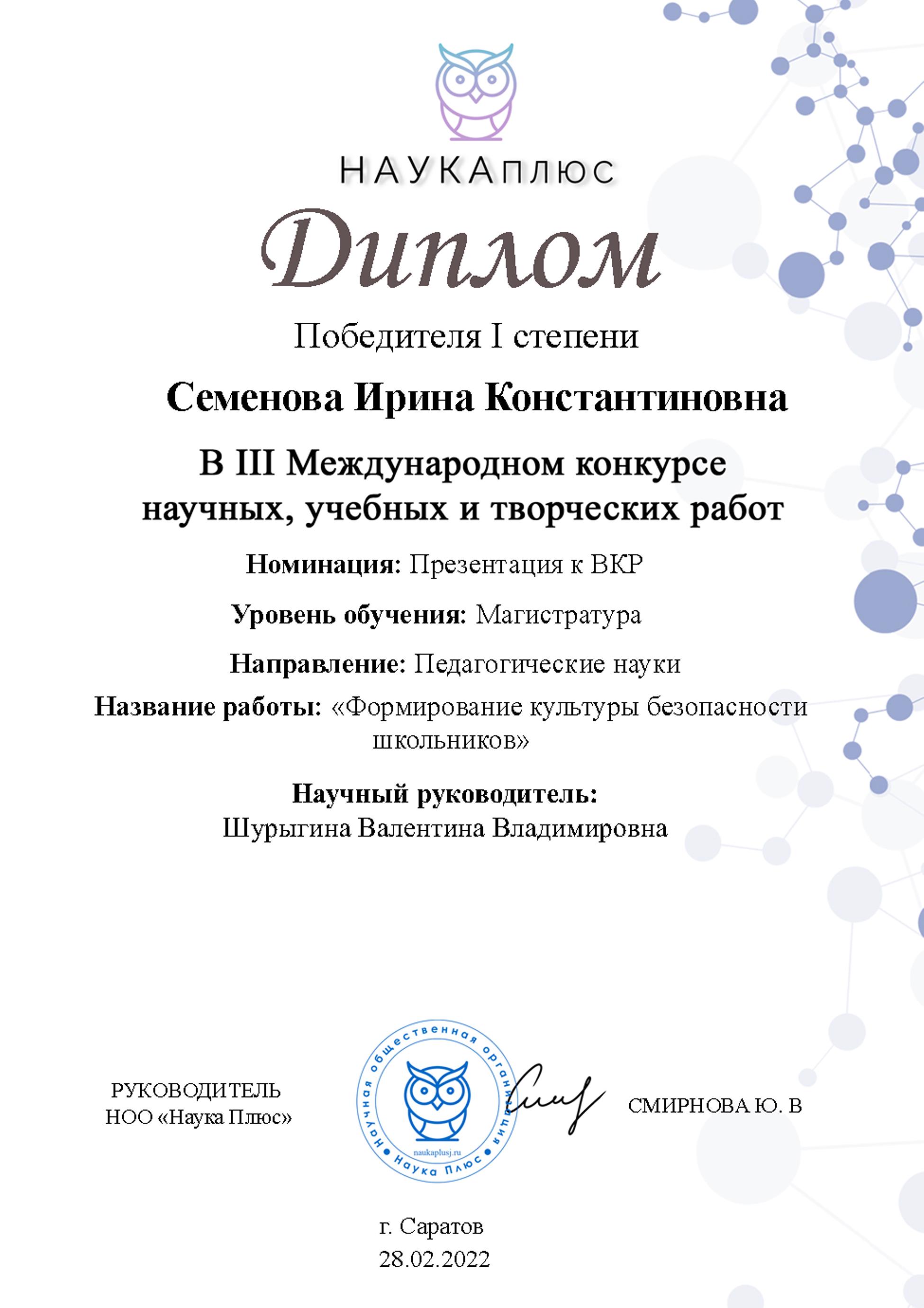 Подведены итоги III Международного конкурса научных, учебных и творческих работ «Наука Плюс». Магистрант Института физической культуры и здоровья человека БГПУ им. М. Акмуллы Ирина Семенова (направление: «Образование в области безопасности жизнедеятельности и здоровьесбережения») стала обладателем сразу двух дипломов победителя конкурса по направлению «Педагогические науки».