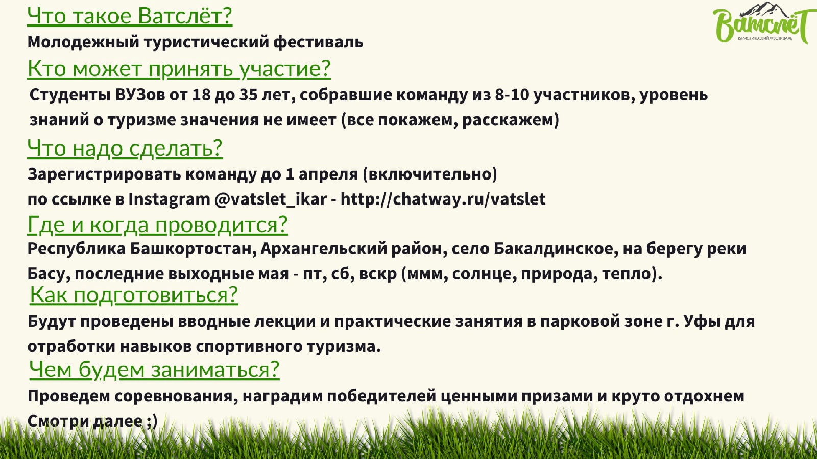 С 26 по 29 мая 2022 года на территории на берегу реки Басу с. Бакалдинское Архангельского района РБ пройдет Молодежный туристический фестиваль «Ватслёт». Мероприятие проводится первичной профсоюзной организацией студентов УГАТУ при поддержке Фонда президентских грантов и туристического клуба УГАТУ «Икар». С 8 апреля по 17 мая состоятся практические и теоретические занятия.