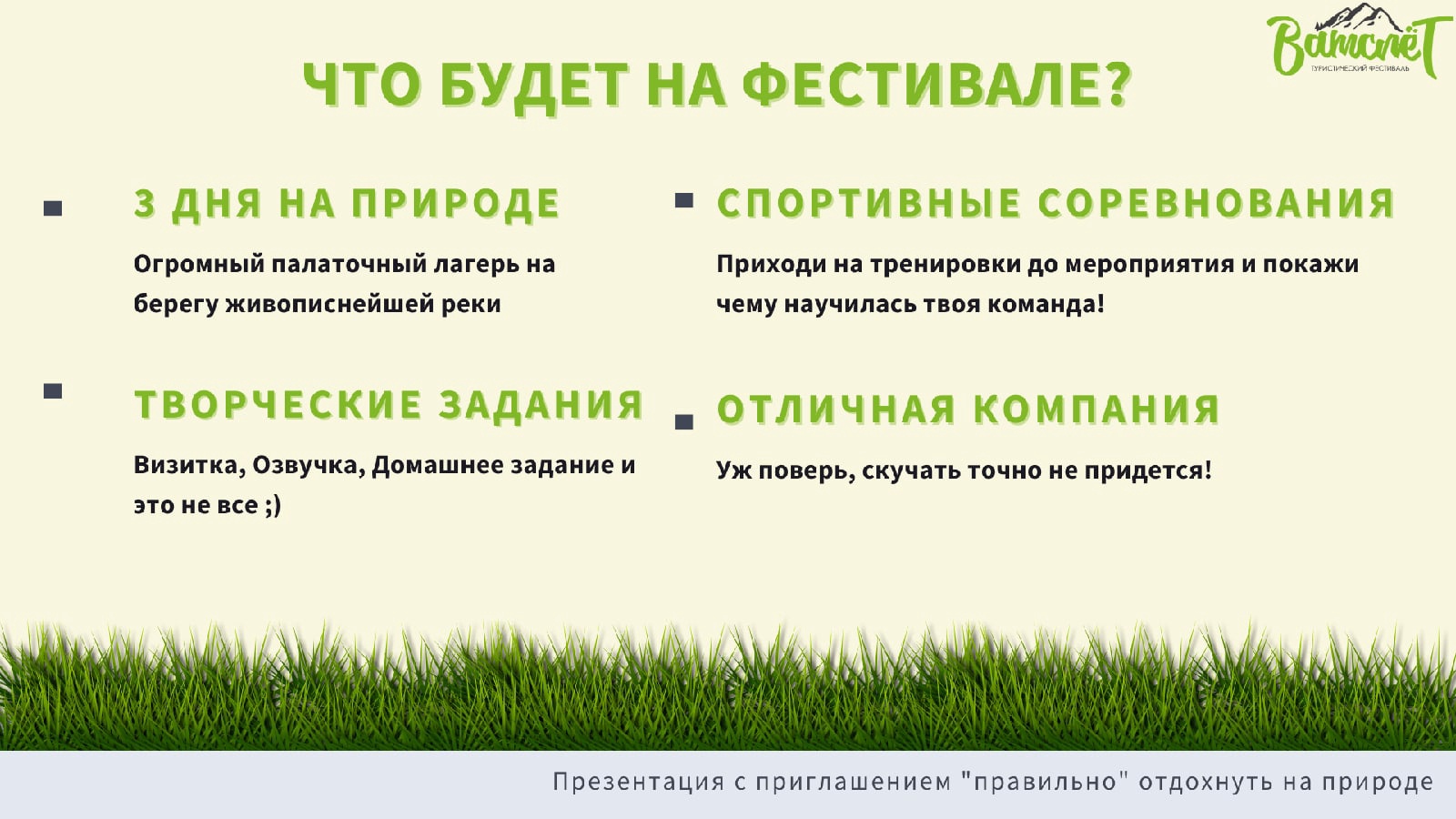 «Ватслёт» – это молодежный туристический фестиваль, который пропагандирует здоровый образ жизни, популяризирует спортивный туризм и приобщает молодежь к этому виду спорта. Фестиваль проводится для студентов вузов Уфы в возрасте от 18 до 35 лет.