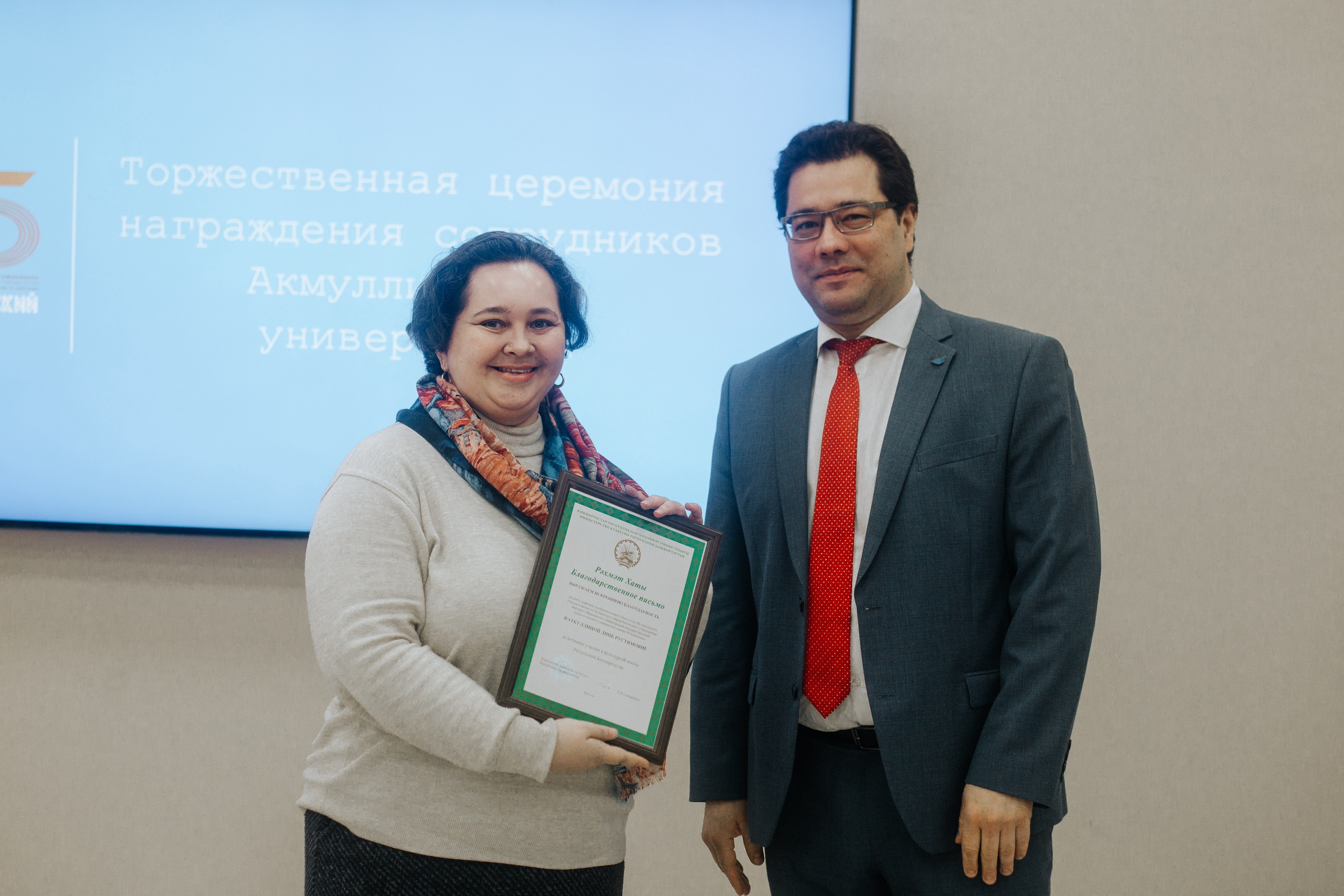 Благодарственными письмами Министерства культуры Республики Башкортостан за активное участие в культурной жизни региона награждены руководитель центра World Skills Акмуллинского университета Наталья Будрина, кандидат педагогических наук, доцент кафедры музыкального и хореографического образования Института педагогики Гузель Дайнова, ведущий специалист по звуку Отдела творческого развития и корпоративной культуры Ильнар Кутдусов, кандидат педагогических наук, доцент кафедры изобразительного искусства художественно-графического факультета Любовь Малинская, кандидат педагогических наук, доцент, заведующий кафедрой музыкального и хореографического образования Татьяна Политаева, доцент кафедры изобразительного искусства художественно-графического факультета Дина Фаткуллина, ведущий специалист-администратор концертных залов отдела творческого развития и корпоративной культуры Фанзалия Шаймарданова.