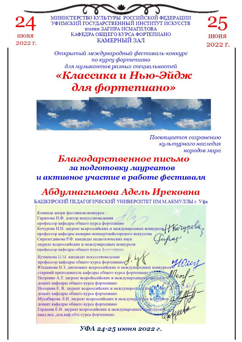 24-25 июня 2022 года в Камерном зале Уфимского государственного института искусств имени Загира Исмагилова прошел VI Открытый международный фестиваль-конкурс по курсу фортепиано «Классика и Нью-Эйдж для фортепиано», посвященный сохранению культурного наследия народов мира. Участниками стали учащиеся детских музыкальных, средних специальных и высших учебных заведений республики, регионов России и зарубежья, для которых инструмент фортепиано не является основным.
