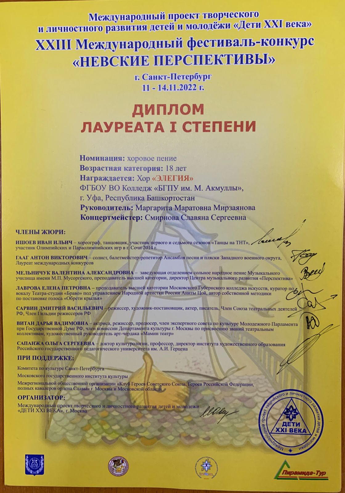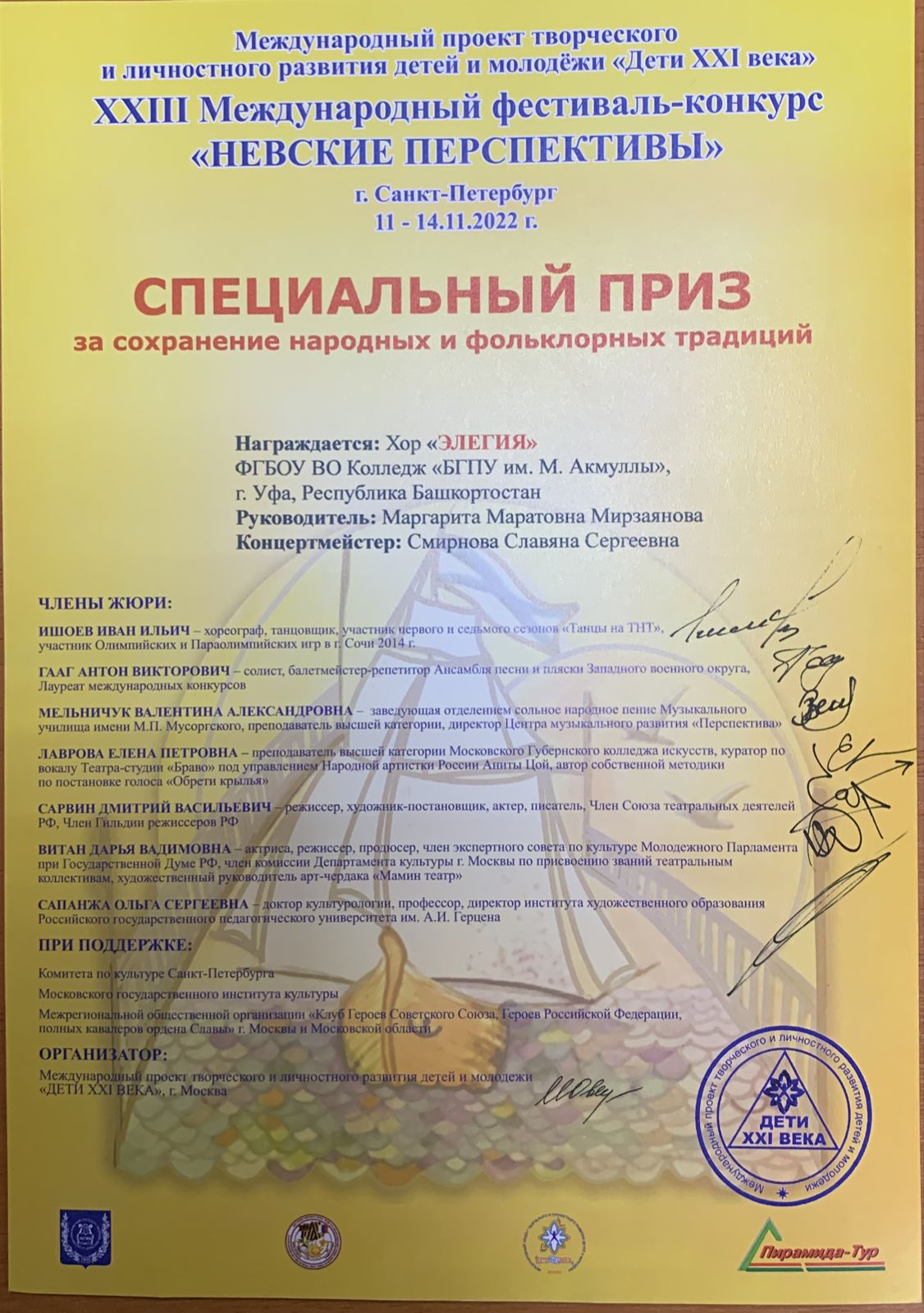 Хор «Элегия» 4 курса Колледжа БГПУ им. М. Акмуллы (руководитель Мирзаянова М.М., концертмейстер Смирнова С.С.) успешно выступил в номинации «Хоровое пение». За исполнение песни «Капли дождя» (муз. Б. Баккарак, сл. Х. Дэвида) и башкирской народной песни «Шаль вязала» в обработке Л.Латыповой, хоровой  коллектив удостоен диплома Лауреата I степени и специального приза «За сохранение народных и фольклорных традиций».