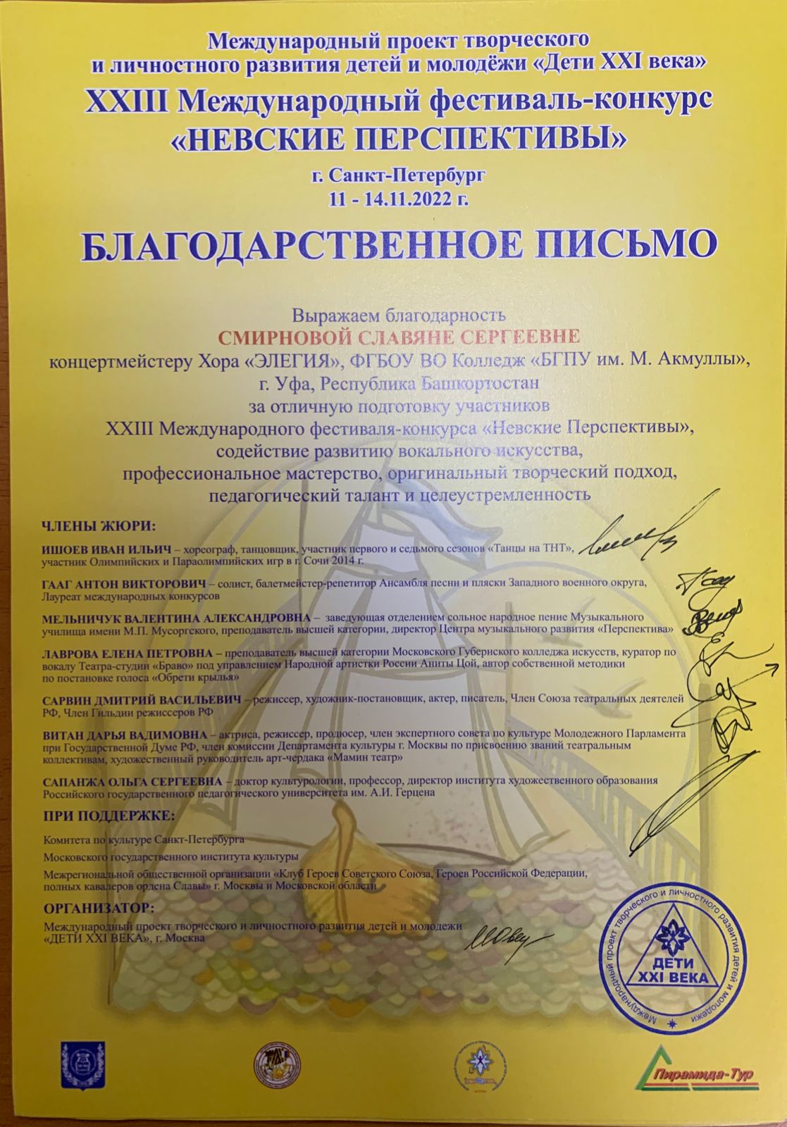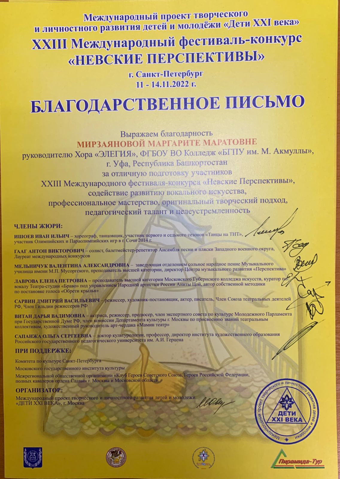 С 11 по 14 ноября 2022 года студенты 4 курса специальности «Музыкальное образование» Колледжа БГПУ им. М. Акмуллы приняли участие в XXIII Международном фестивале-конкурсе «Невские перспективы» в г. Санкт-Петербург. Фестиваль-конкурс, организованный Международным проектом творческого и личностного развития детей и молодежи «Дети XXI века» (г. Москва), имеет гуманитарную направленность и призван формировать у детей и юношества активную гражданскую позицию через патриотическое воспитание и творчество, укреплять дружбу народов и межнациональное согласие.