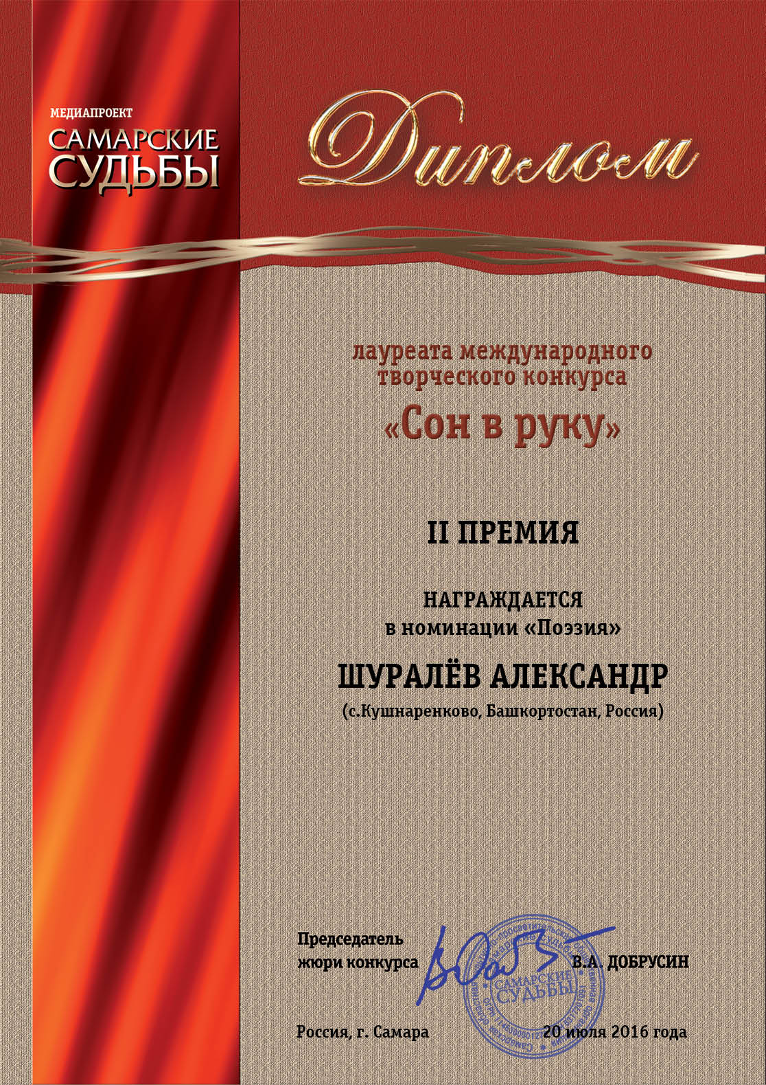 По итогам конкурса «Сон в руку» (465 авторов)  А.М. Шуралев стал лауреатом с присуждением второй премии за художественное описание воспоминаний о детстве в стихотворении «Сны о родительском доме».