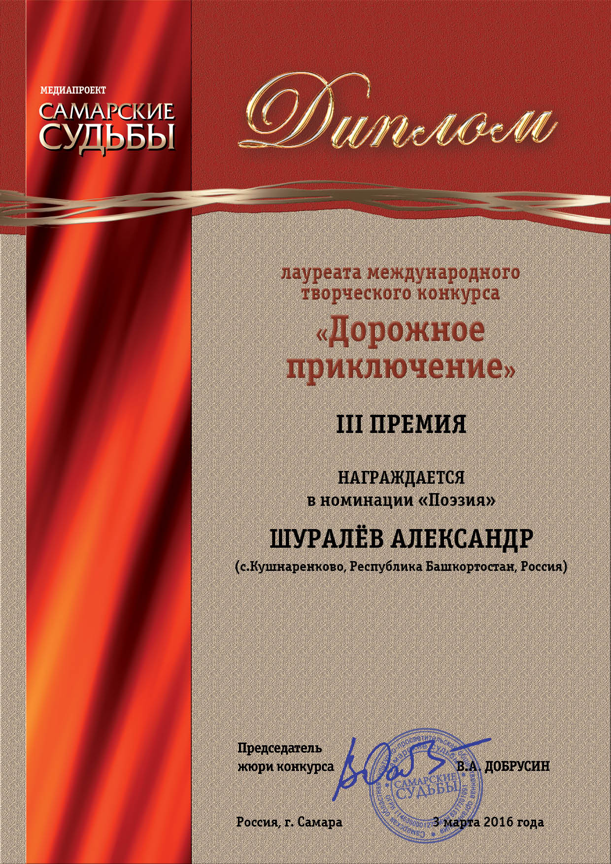 Успешным стало выступление А.М. Шуралёва в конкурсе «Дорожное приключение», в котором состязались поэты из России, Австралии, Белоруссии, Дании, Израиля, Казахстана, Латвии, Таиланда, Узбекистана, Украины.   А.М. Шуралёву присуждена третья премия за художественное описание     путешествия в стихотворении «Орёл».