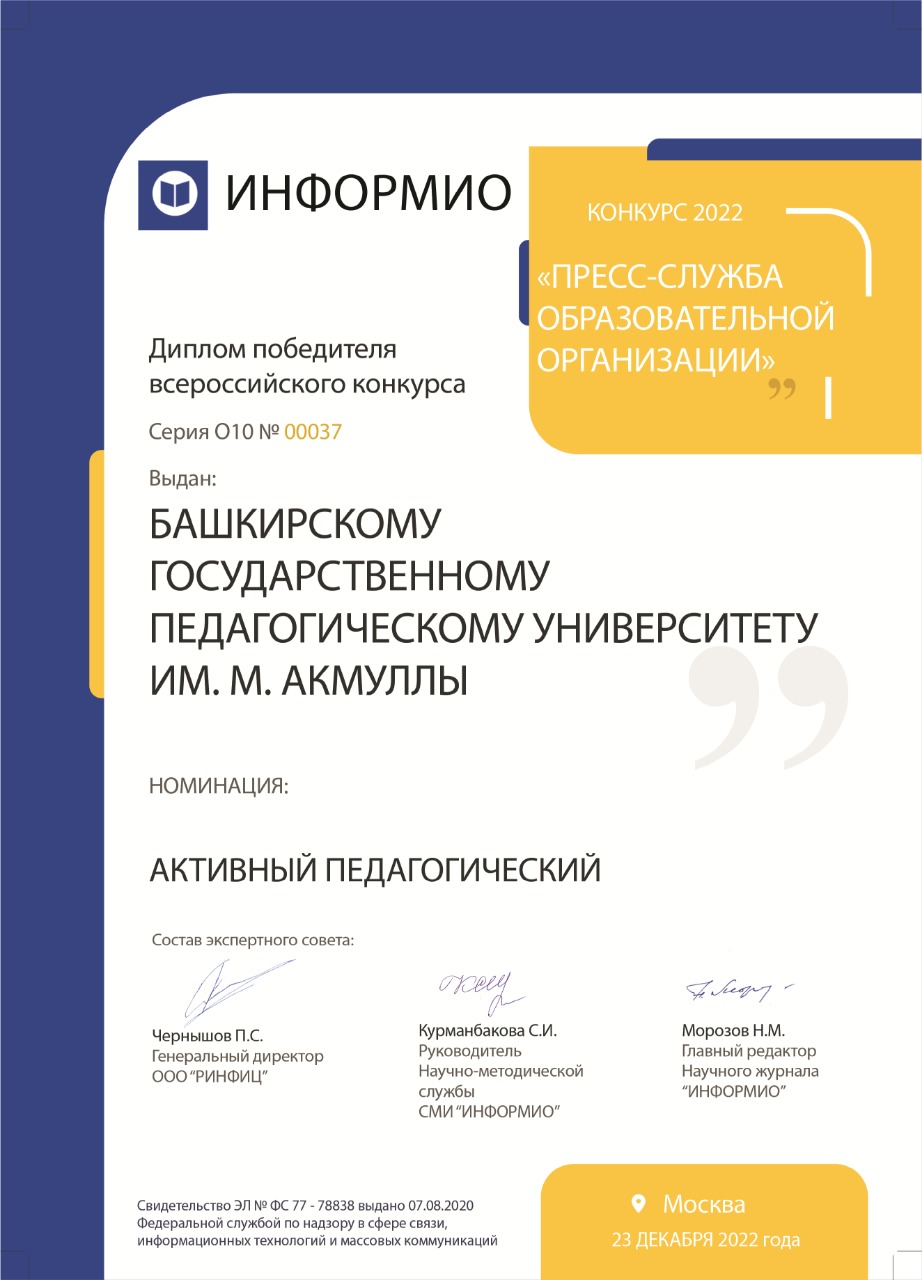 23 декабря 2022 года электронный справочник «Информио» подвел итоги Всероссийского конкурса «Пресс-служба образовательной организации». По итогам конкурса БГПУ им. М.Акмуллы признан одним из лидеров конкурса и награжден дипломом победителя в номинации «Активный педагогический».