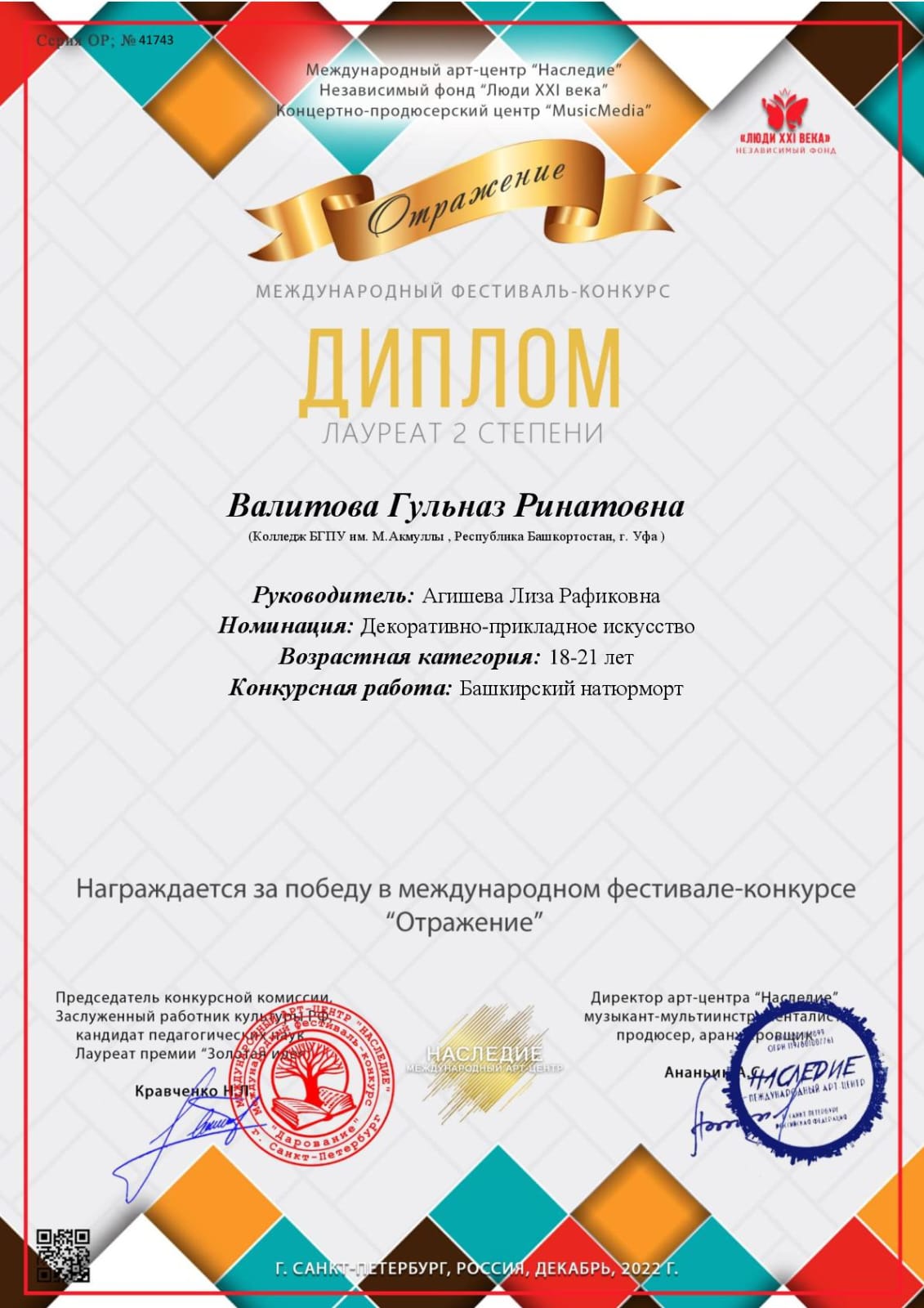 В Санкт-Петербурге подвели итоги Международного фестиваля-конкурса искусств «Отражение», который проходил с 1 по 27 декабря 2022 года в заочном формате. В нем приняли участие студенты и преподаватели специальности «Изобразительное искусство и черчение» Колледжа Акмуллинского университета. Учредителями и организаторами конкурса являются Творческая мастерская «Колибри» и Международный арт-центр «Наследие» г. Санкт-Петербург.