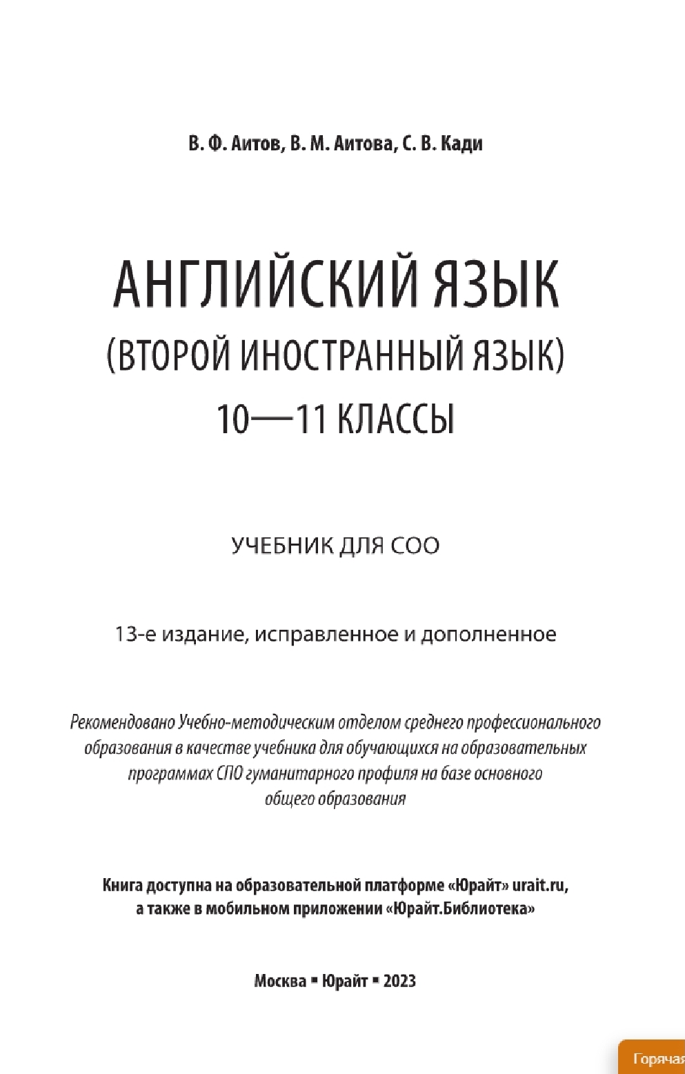 В центральном издательстве вышел новый учебник «Английский язык (второй иностранный язык)» для  10 −11 классов. Авторами издания являются Аитов Валерий Факильевич – доктор педагогических наук, заведующий кафедрой методики преподавания иностранных языков и 2-го иностранного языка Института филологического образования и межкультурных коммуникаций БГПУ им. М.Акмуллы, Аитова Вера Михайловна – старший преподаватель кафедры иностранных языков Башгоспедуниверситета и Кади Светлана Вячеславовна – старший преподаватель кафедры лингводидактики и перевода Санк-Петербургского политехнического университета Петра Великого.
