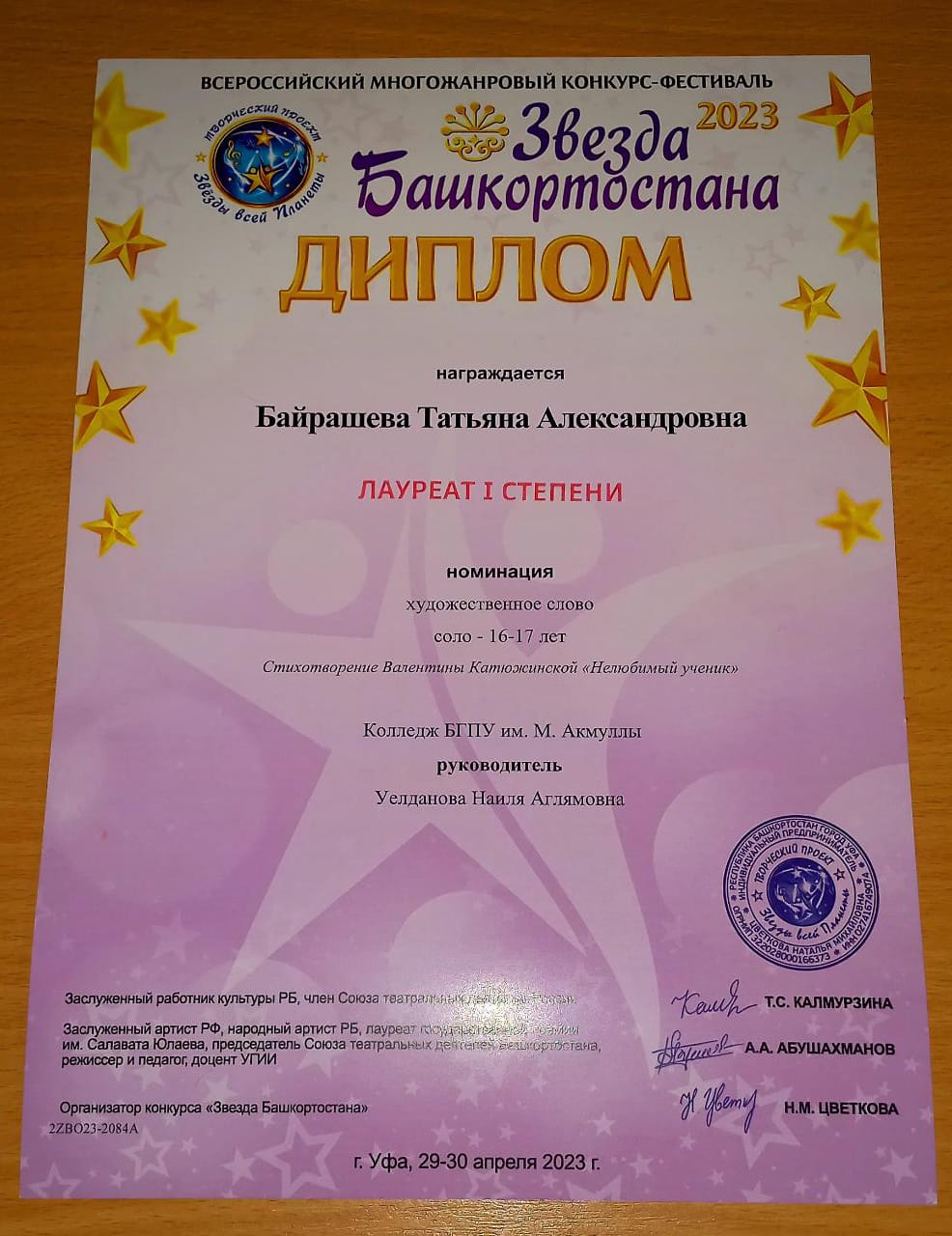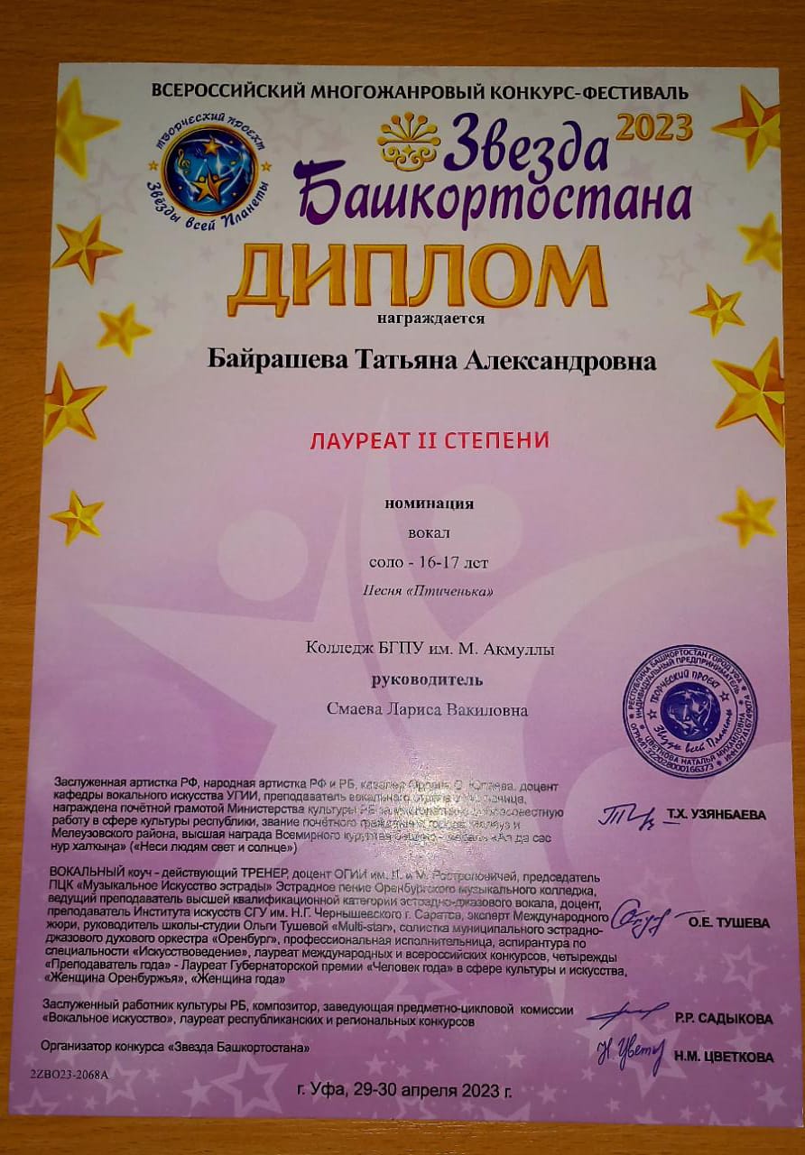 Также в этом же конкурсе студентка 1 курса Колледжа БГПУ им. М. Акмуллы Татьяна Байрашева стала победителем в номинации художественное слово и   лауреатом II степени в номинации вокал.